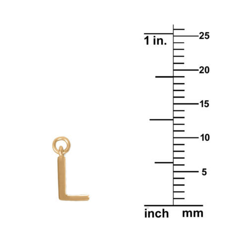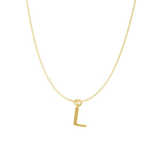 Initials are a classic piece of jewelry that never goes out of style. This design features a classic text style featuring a small initial ?L? in 14-karat yellow gold plated sterling silver. The small pendant measures approximately 3/8? long. There will be a 14/20 gold filled cable chain necklace that is 1.5mm wide added to the pendant. The gold chain has a spring ring closure and comes individually carded in 16, 18, 20, and 24 inches long.