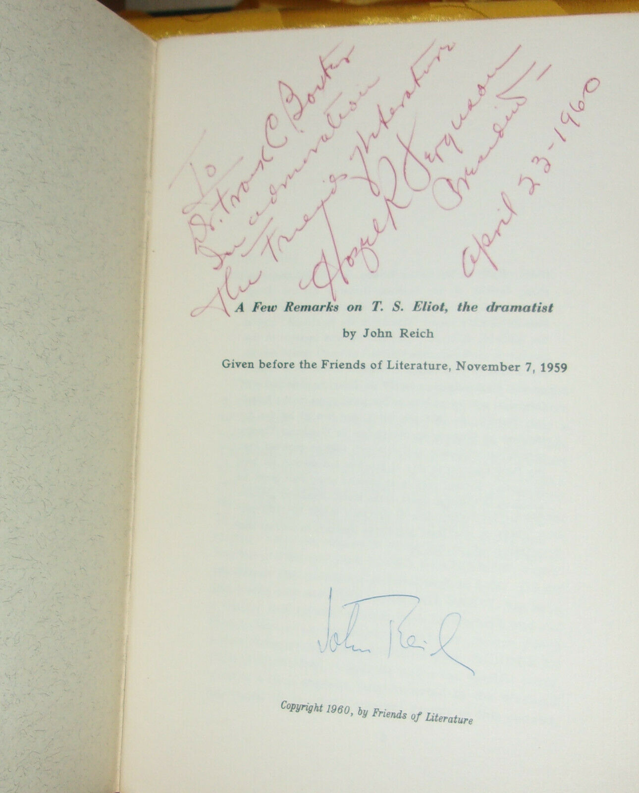 John Reich A FEW REMARKS ON T.S. Eliot THE DRAMATIST First Edition Double SIGNED