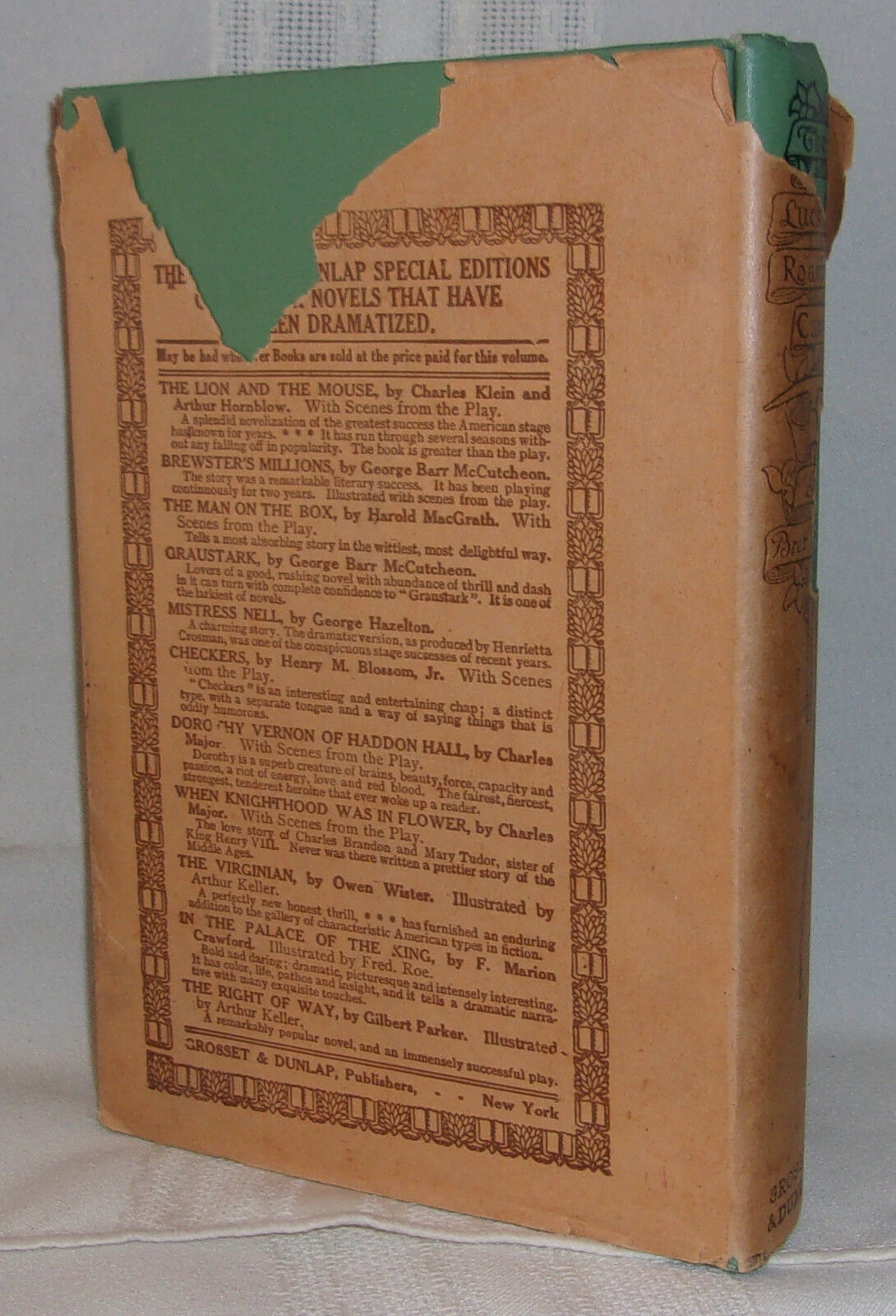Green illustrated cloth with black titles and decoration to front and spine; in the original turn-of-the century brown illustrated dust jacket.