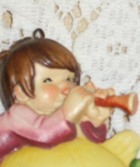 Part of the Anri Woodies Collection 1956-1992, this little one is sitting on a smiling sun and playing a flute. A tiny bird is enjoying the serenade. This series was hand caved in real maple and hand painted in transparent oils. Both sides are detailed. Hanger is 5" long and clear thread. Note the angel's gown is a solid color vs new reproductions. Measures 3" x 3". Check my booth for other darling ornaments in this series.