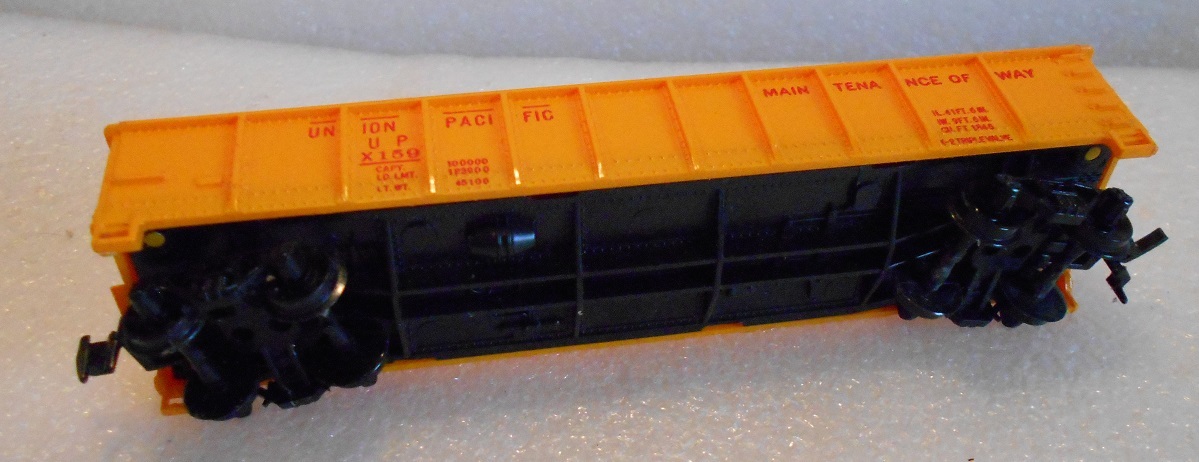Made by Tyco, USA, the car length is about 6 inches, with a plastic chassis, plastic axles on the trucks, that are snap-fit onto the chassis. There are two... one is a darker duller orange shade.