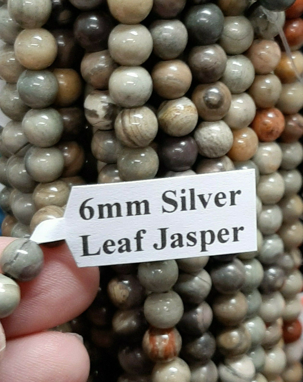 This item is 1 strand of approximately 60 6mm Silver Leaf Jasper Round Beads temporarily strung.