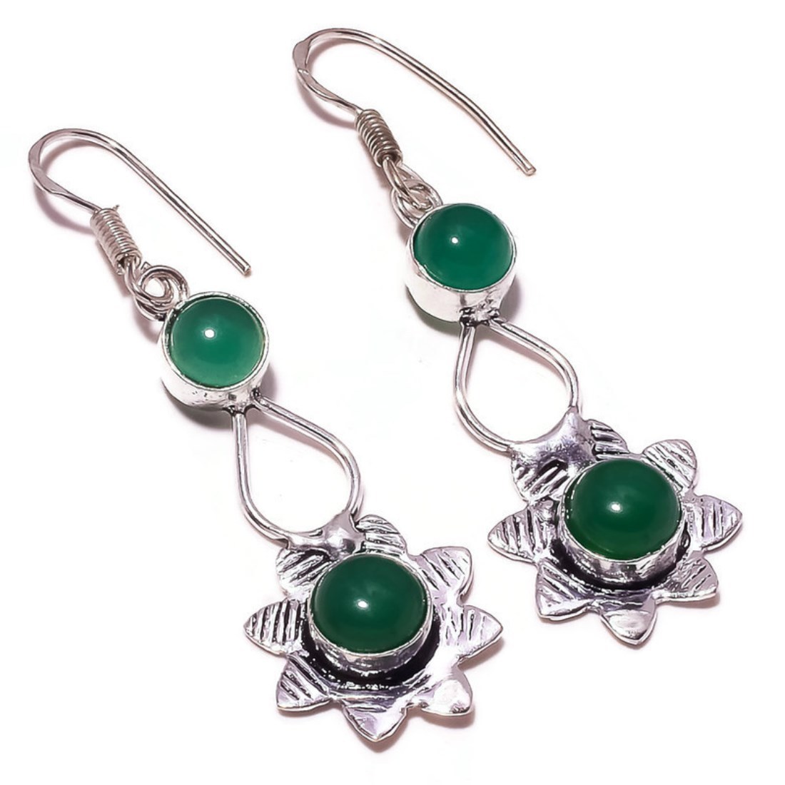 Green Onyx Round Gemstone 925 Silver Overlay Handmade Drop Dangle Flower Earrings