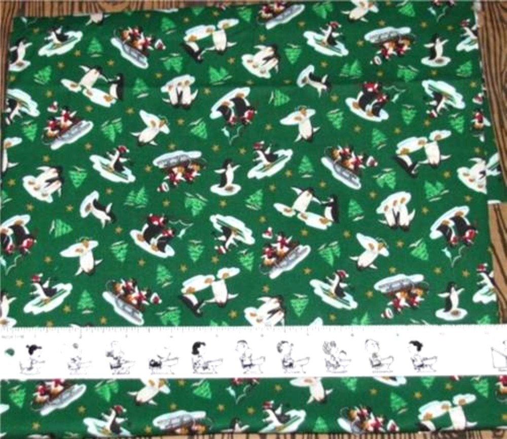 SLEDING PENGUINS on GREEN Cotton Quilting Fabric 24" long x 45" wide