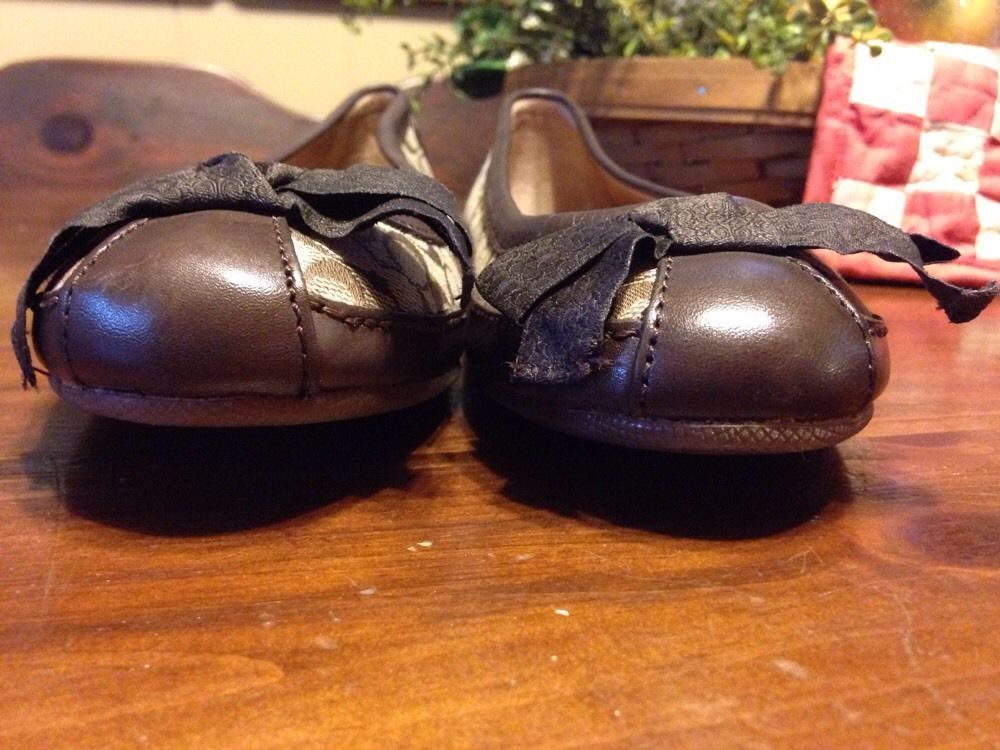Super cute pair of women's brown leather and signature C Coach pattern ballet flats by Coach. Dark brown leather trim accented by brown and tan classic coach signature C pattern. Brown bow on each shoe with tone on tone signature coach pattern as well. Embossed Coach New York logo on back of both heels. Brown rubber soles