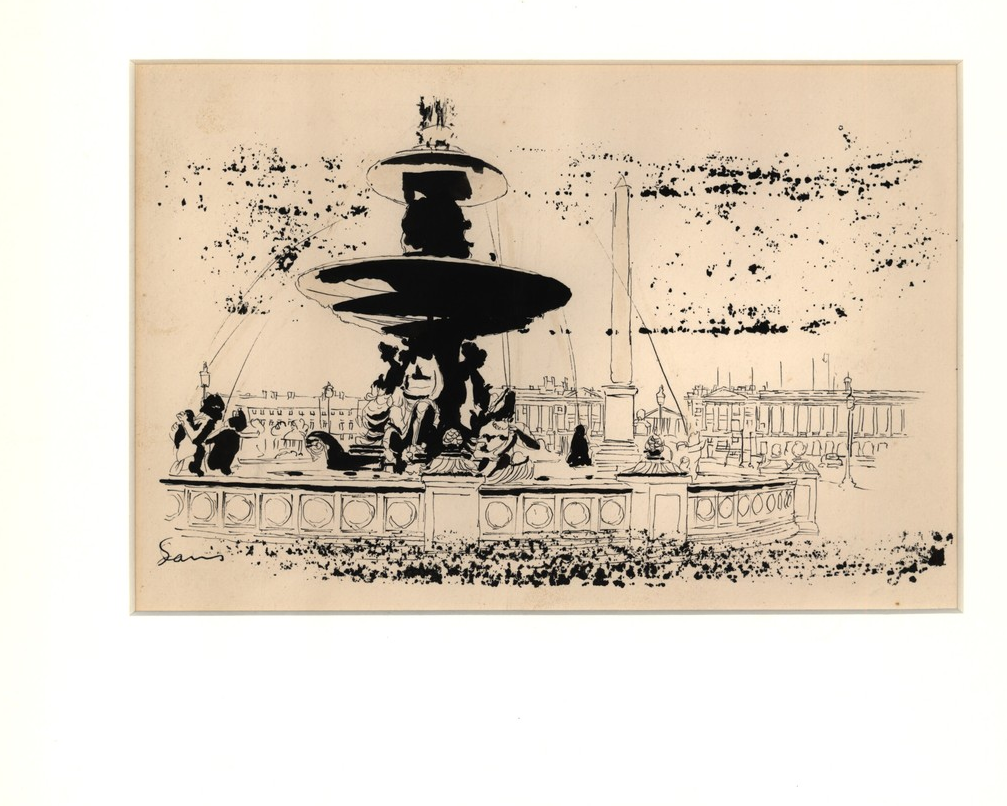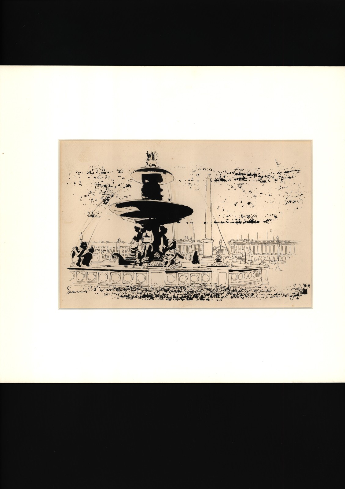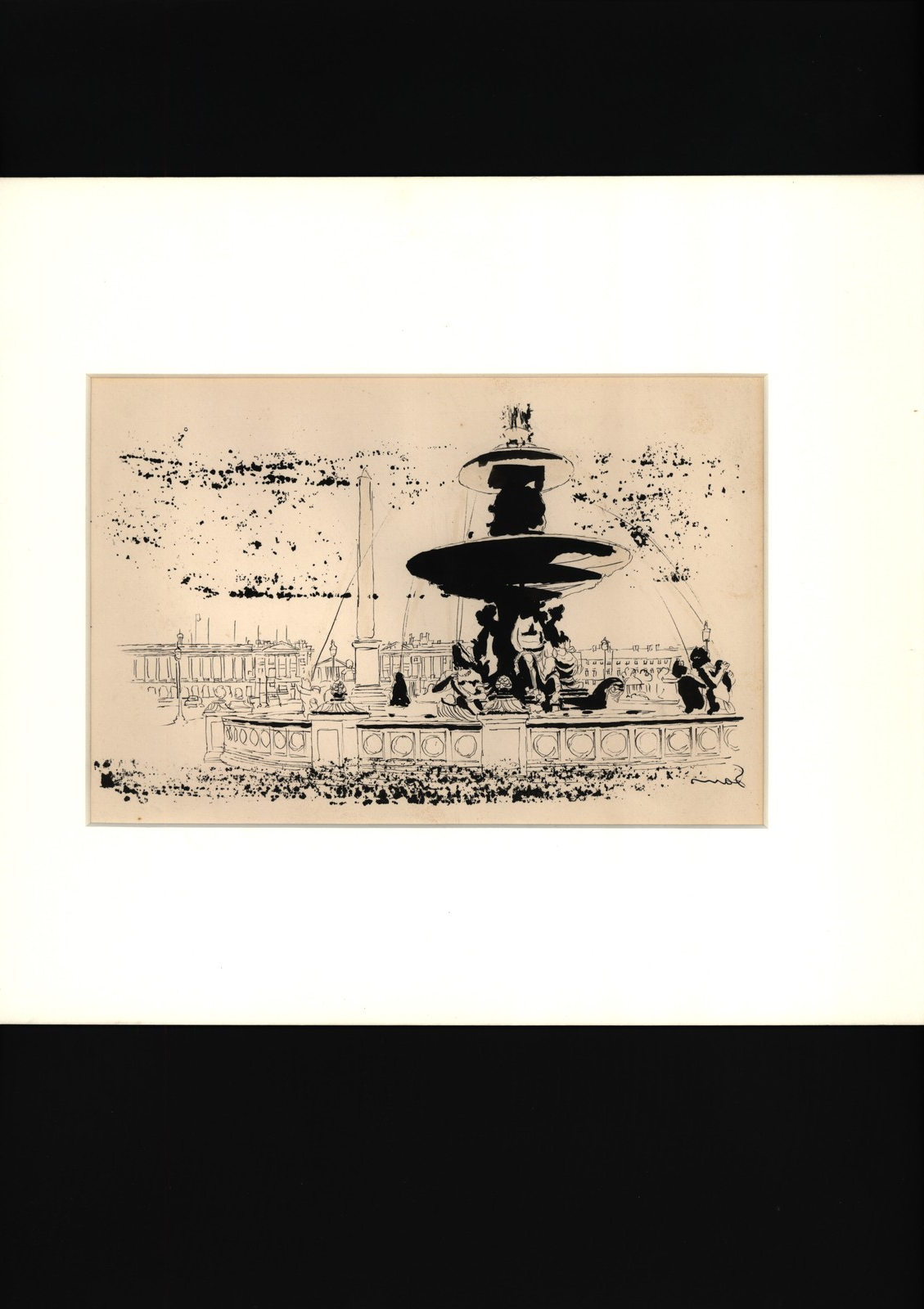 The is a woodcut print of a 1924 illustration of a Parisian scene with a fountain. The original illustration is