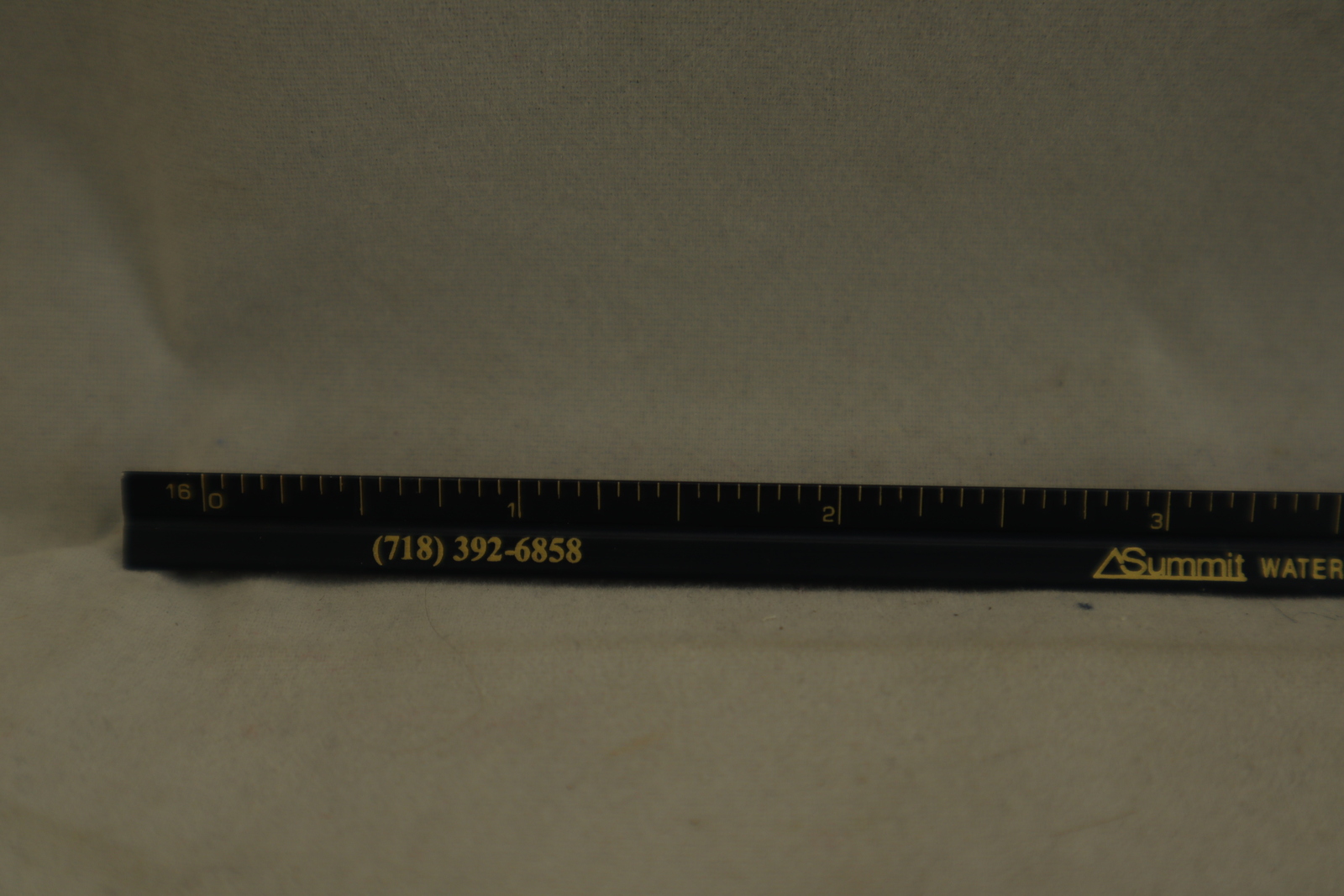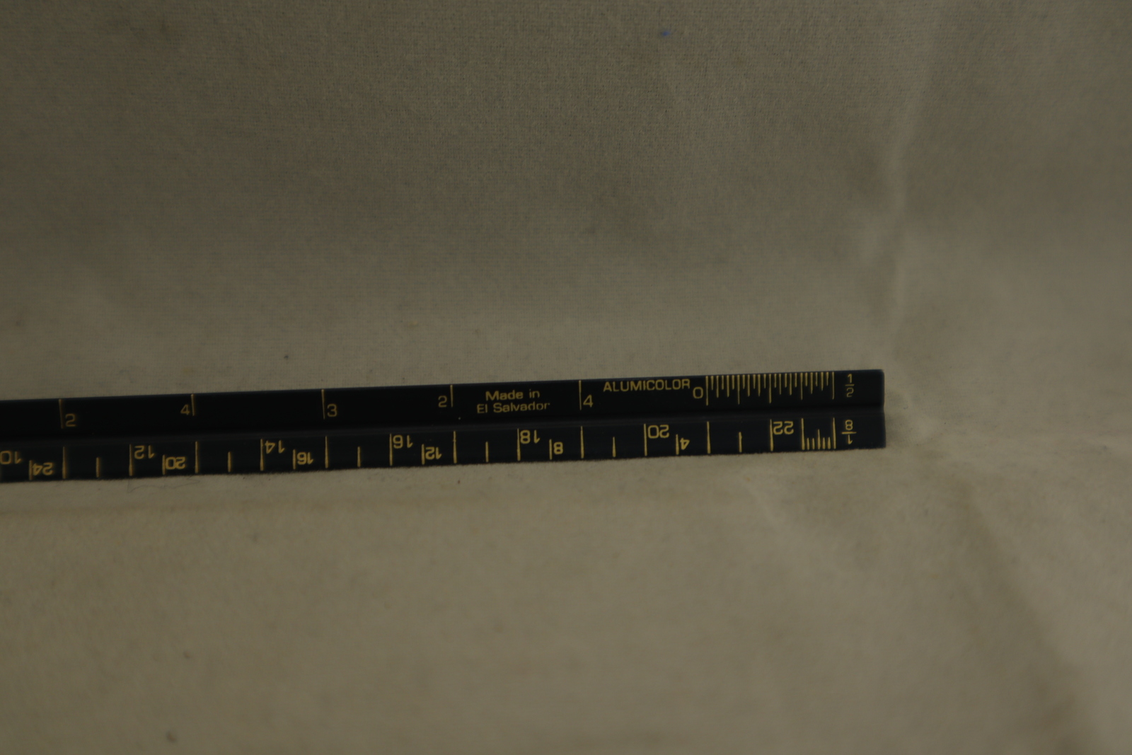 Other Information: This ruler is made by Alumicolor and is a dark blue color with gold markings. It has a business name engraved on one side of the ruler.