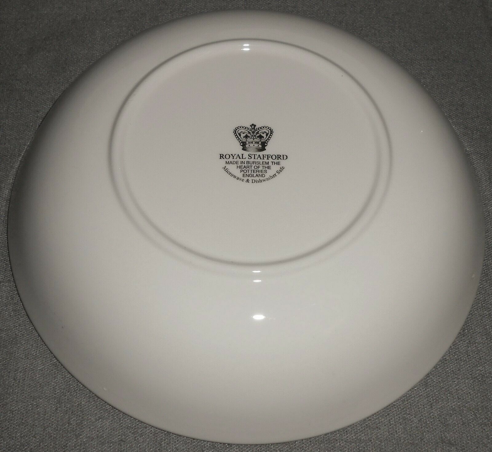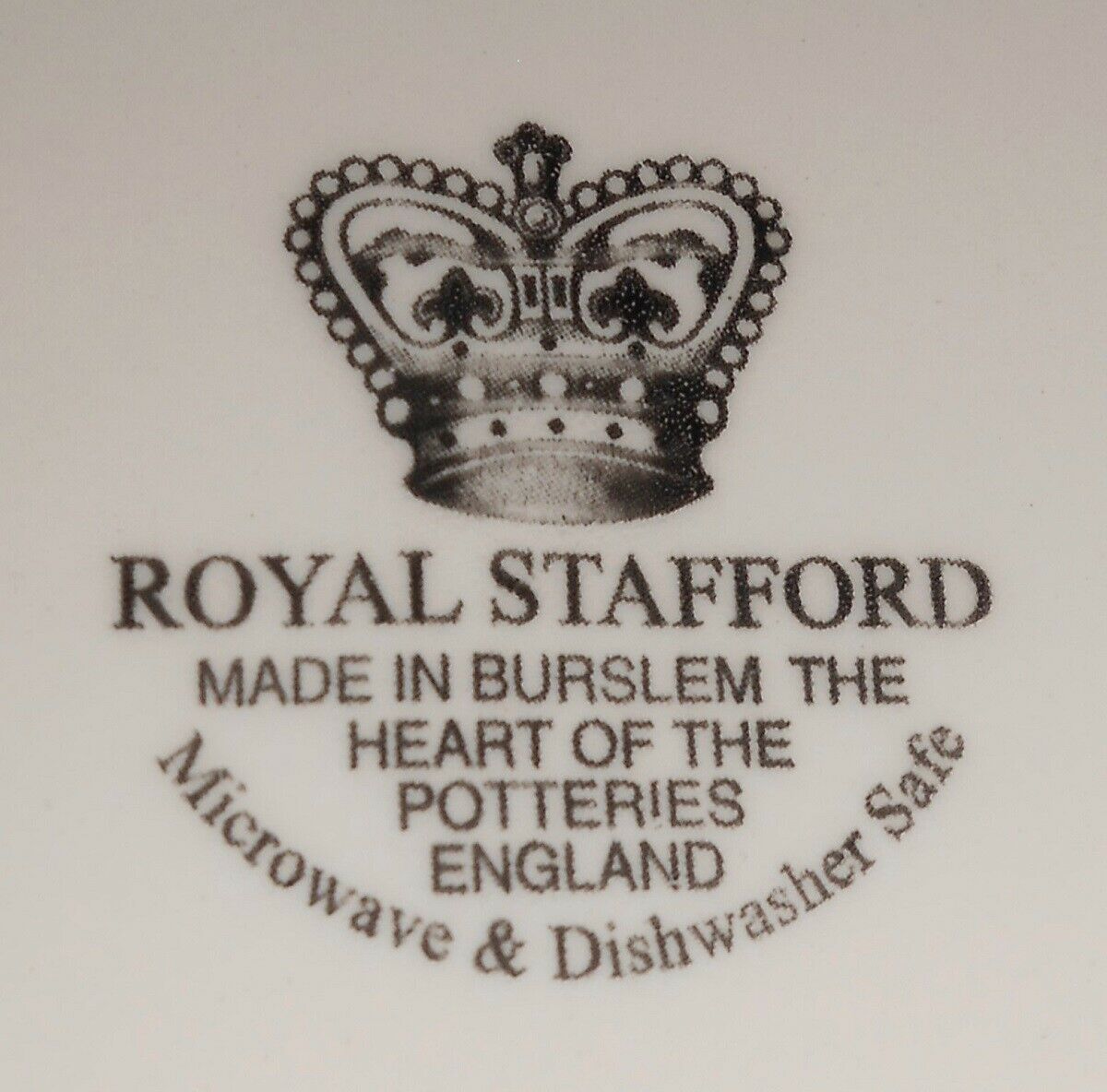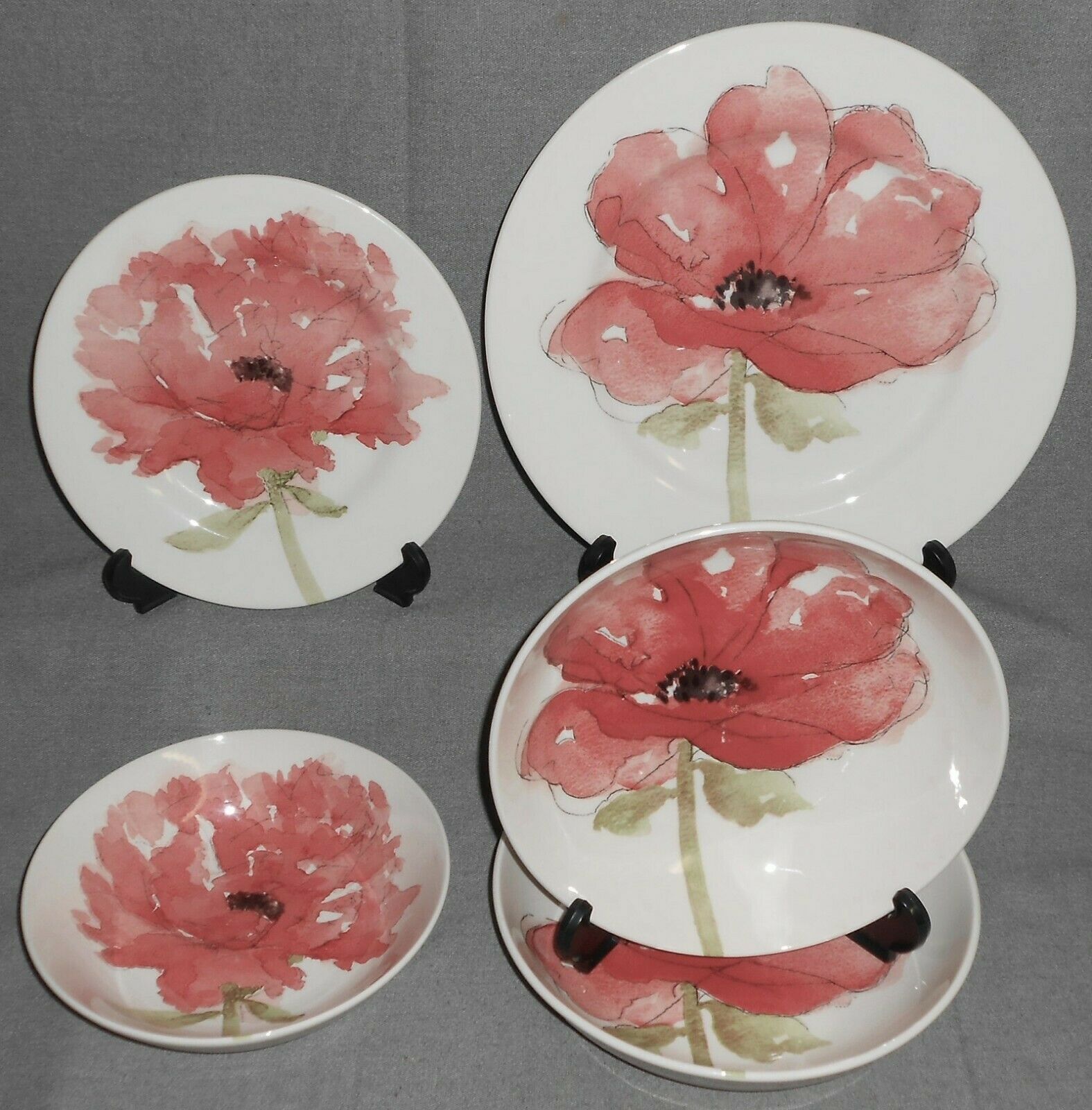 This is a five piece set that includes (1) 11" Dinner Plate, (1) 8 1/2" Salad Plate, (1) 7 5/8" Soup or Cereal Bowl and (2) 8 7/8" Round Vegetable or Serving Bowls from Royal Stafford in the Red Poppy Pattern and Made in England. They are all in good pre-owned condition with no chips or cracks.