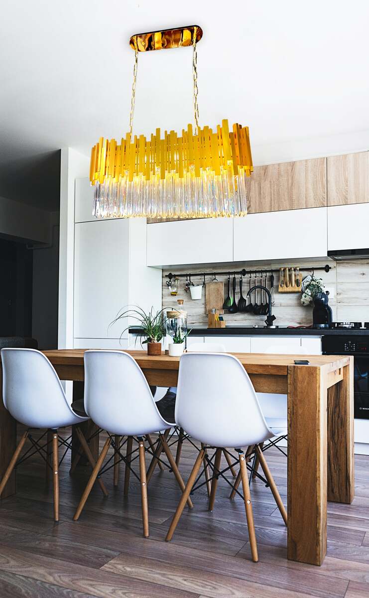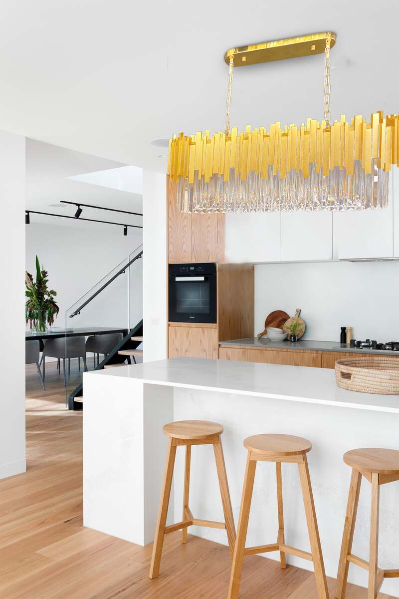 Crafted with a refined silhouette, this linear gold chandelier brings architectural elegance and radiant clarity to contemporary interiors. The matte gold frame pairs beautifully with rectangular crystal prisms, creating a luxurious interplay of shimmer and depth. Designed to illuminate dining tables, kitchen islands, bar, and open living spaces, its sleek profile elevates any room with effortless modern refinement.