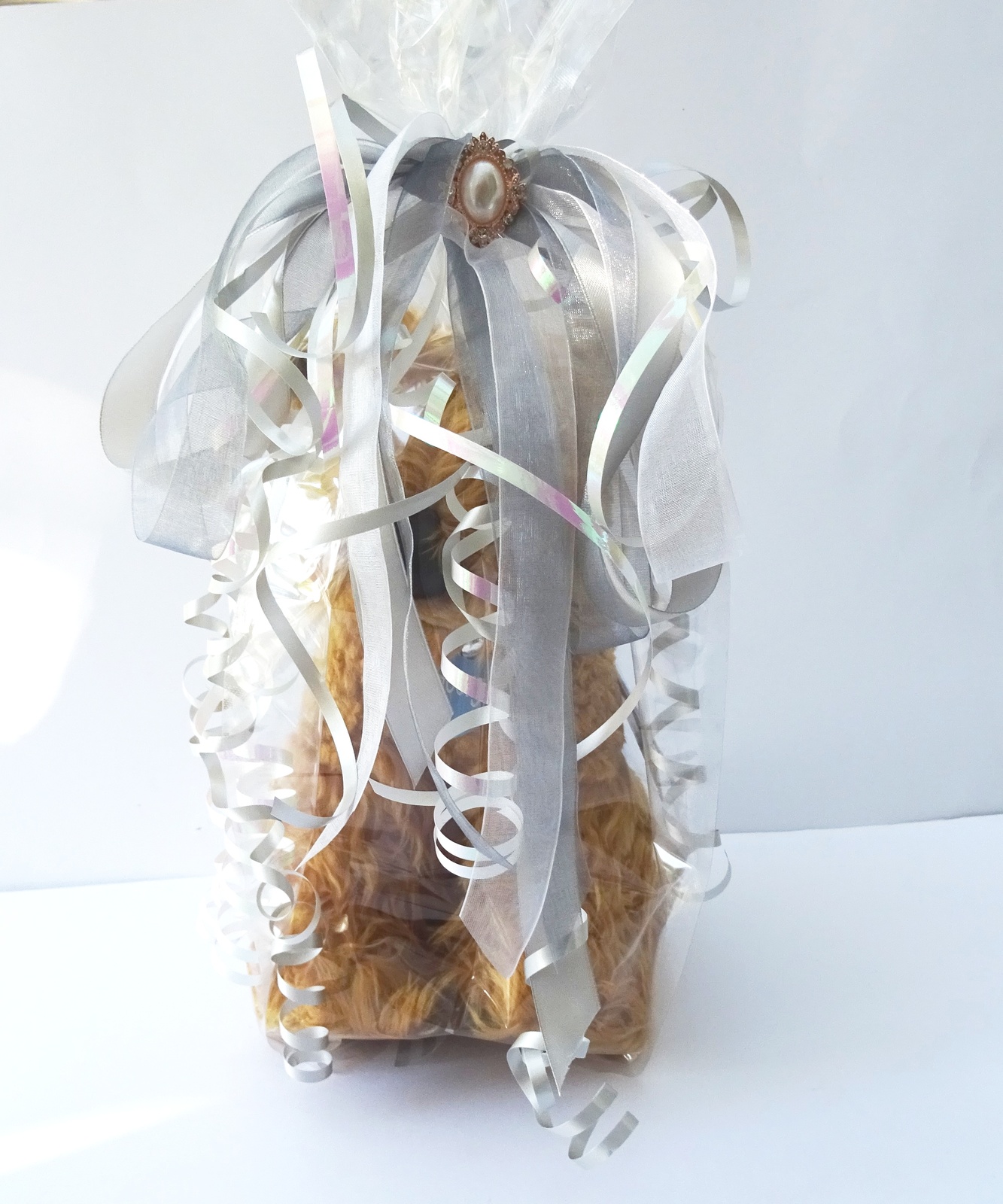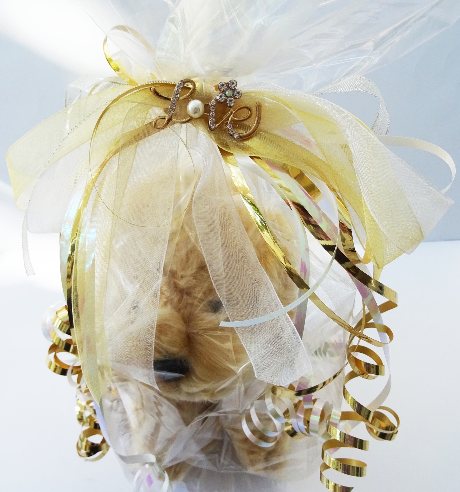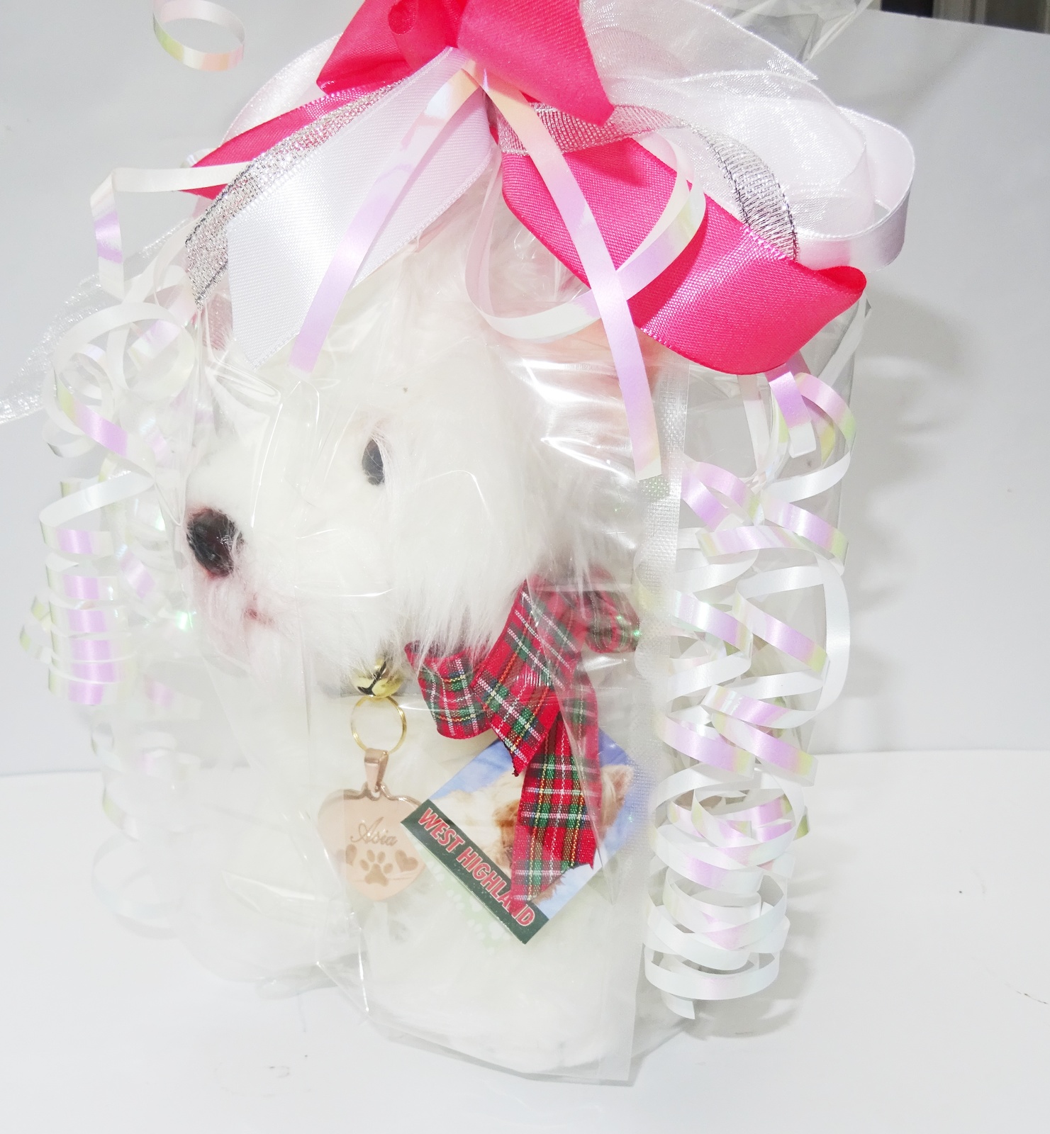 fitted with a collar with a personalised tag attached, then we wrap them in presentation wrapping topped with a decoration tied off with pretty coloured ribbons, ribbon colours can be chosen if you have a preference.