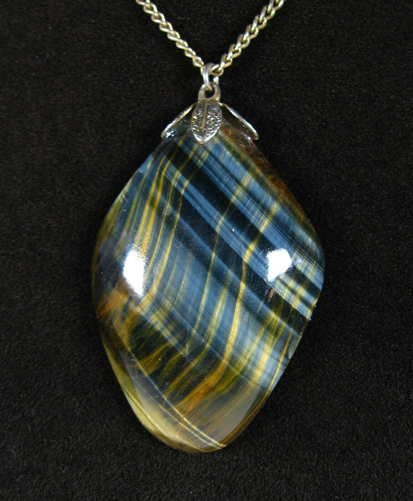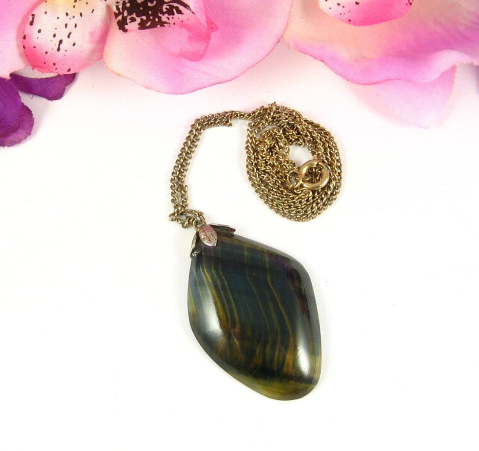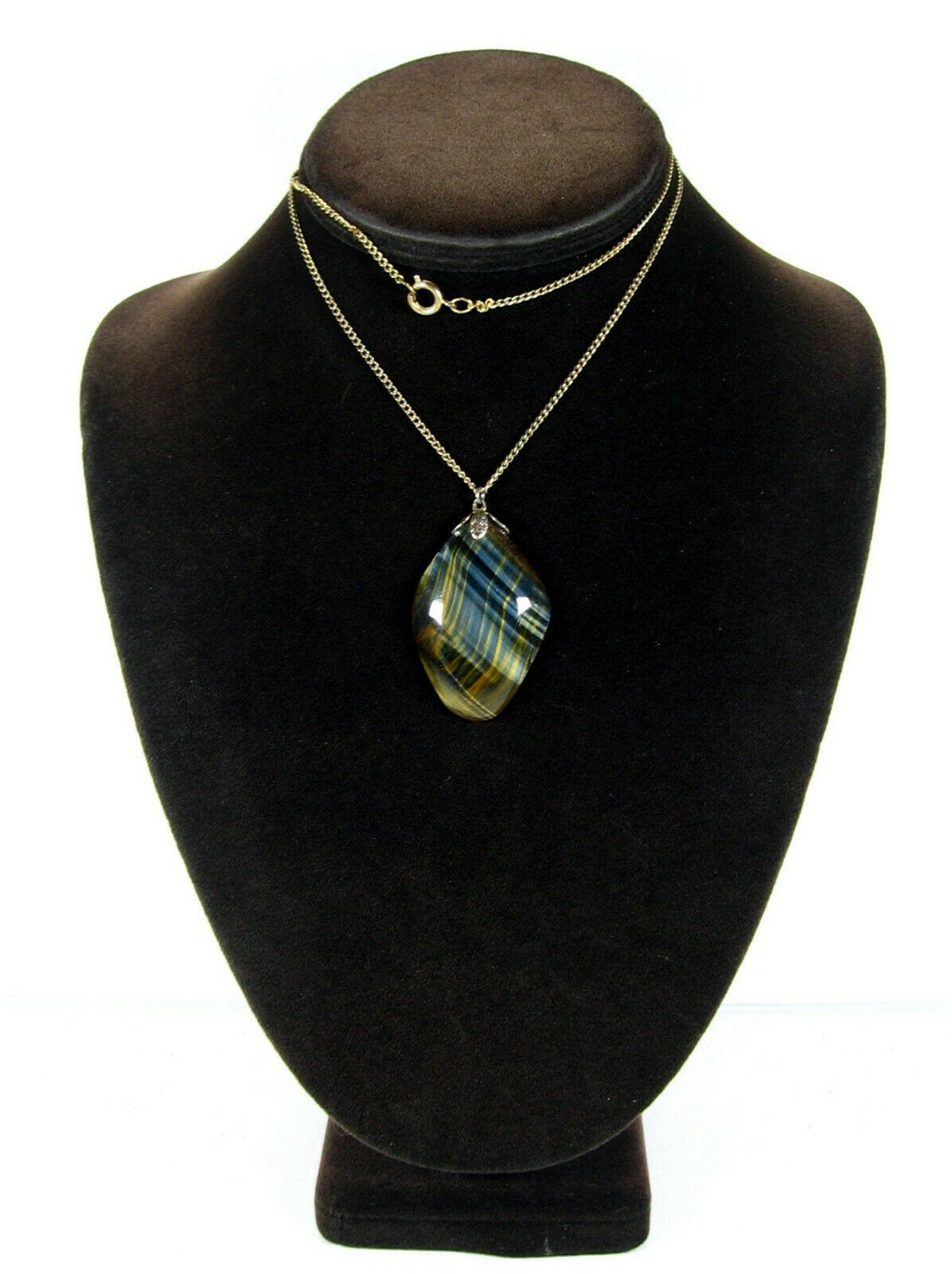 Big TIGER'S EYE STONE PENDANT Vintage Necklace Goldtone Brown Shimmer Shine 24"