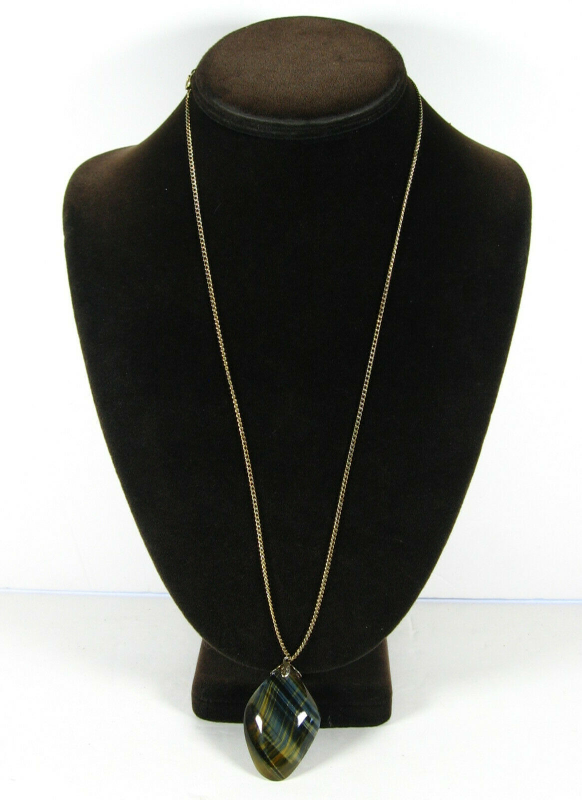The goldtone chain holds a roughly diamond-shaped pendant of polished tiger's eye stone.