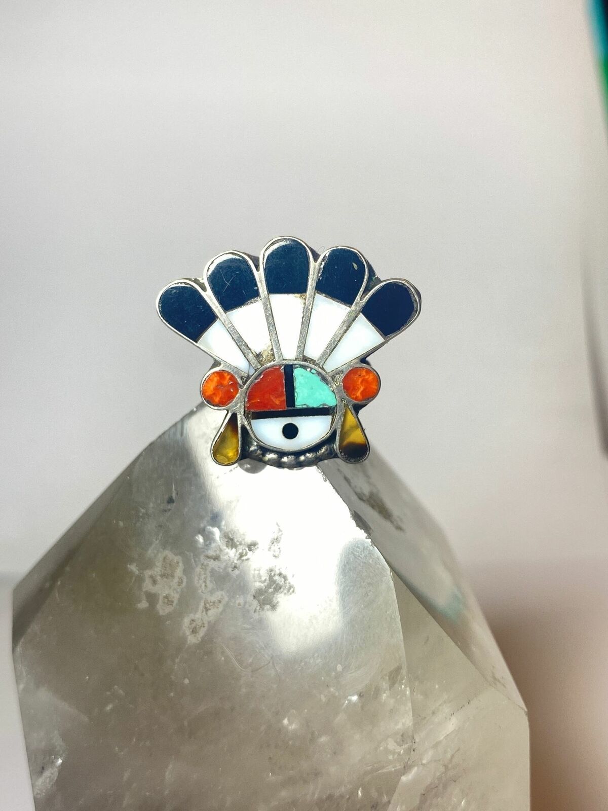 Sun face ring coral turquoise onyx Zuni pinky sterling silver girls size 3.75