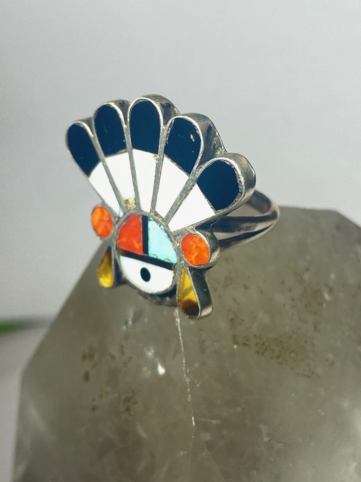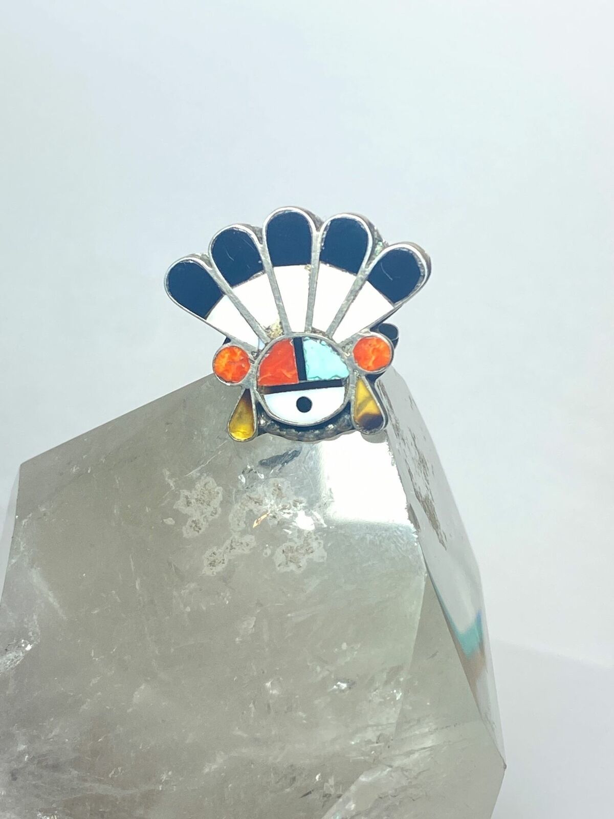 Sun face ring coral turquoise onyx Zuni pinky sterling silver women girls
