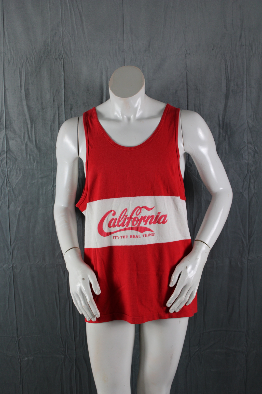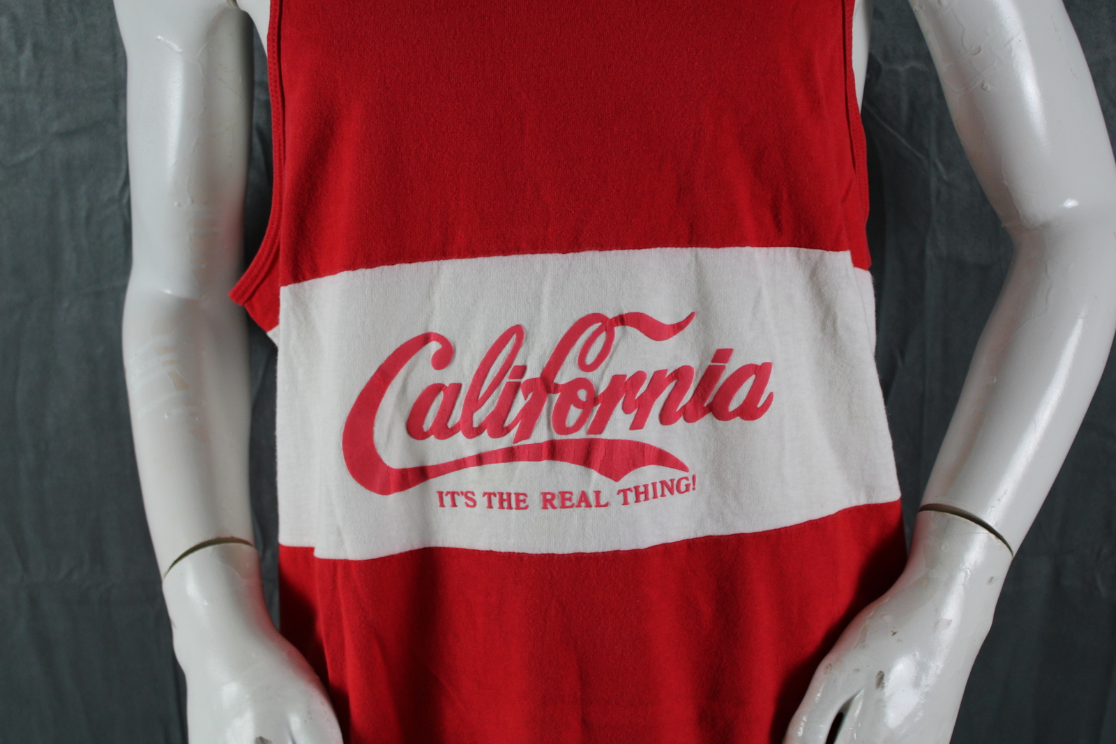 Up for sale is a vintage graphic tank top. It has a red body with a white stripe across the middle of the tank top. The front of the tank has California in script with it's the real thing underneath in red. The graphic is done in thick puffer print. What an amazing vintage tank do not miss out on it.