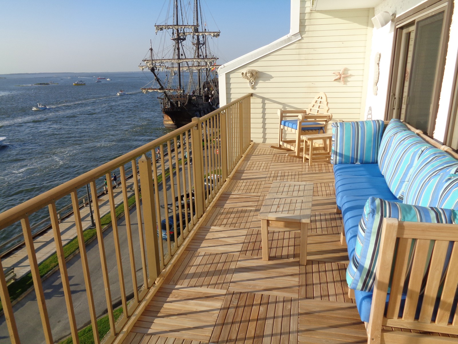 Teak Indoor/Outdoor Floor Tiles..Each...19.75" Square x 1.75" H...11 lbs...the perfect flooring alternative for decks, saunas, showers..etc. Tiles are slatted allowing water and sand to run through them. Just butt them against one another..they're very heavy. And they can be cut to fit up to a wall...etc...see our pictures of one of our customer's deck that used our teak tiles........(By the way.......that's Not our Tall Ship seen in the Background of these pictures!) Standard Freight Shipping on 2 packs or more.