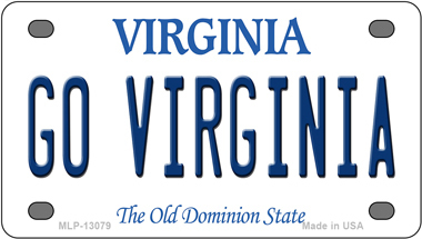 Go Virginia Novelty Mini Metal License Plate Tag. 2.2" x 4" high gloss novelty mini metal license plate tag. Made of the highest quality aluminum for a weather resistant finish. It is lightweight and durable. Pre-drilled holes for quick and easy mounting on any vehicle, or add a ribbon, wire or string to instantly turn this license plate into a sign and display it on a wall or door. Individually shrink-wrapped and proudly made in the USA.