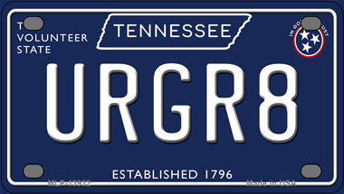 URGR8 Tennessee Blue Novelty Mini Metal License Plate. 2.2" x 4" high gloss Novelty Mini Metal License Plate Tag. Made of the highest quality aluminum for a weather resistant finish. It is lightweight and durable. Pre-drilled holes for quick and easy mounting on any vehicle, or add a ribbon, wire, or string to instantly turn this license plate into a sign and display it on a wall or door. Individually shrink-wrapped and proudly made in the USA.