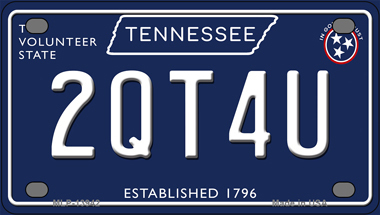 2QT4U Tennessee Blue Novelty Mini Metal License Plate. 2.2" x 4" high gloss Novelty Mini Metal License Plate Tag. Made of the highest quality aluminum for a weather resistant finish. It is lightweight and durable. Pre-drilled holes for quick and easy mounting on any vehicle, or add a ribbon, wire, or string to instantly turn this license plate into a sign and display it on a wall or door. Individually shrink-wrapped and proudly made in the USA.