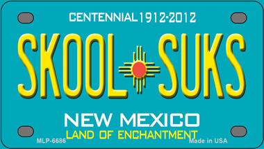 Skool Suks New Mexico Teal Novelty Mini Metal License Plate Tag. 2.2" x 4" high gloss novelty mini metal license plate tag. Made of the highest quality aluminum for a weather resistant finish. It is lightweight and durable. Pre-drilled holes for quick and easy mounting on any vehicle, or add a ribbon, wire or string to instantly turn this license plate into a sign and display it on a wall or door. Individually shrink-wrapped and proudly made in the USA.