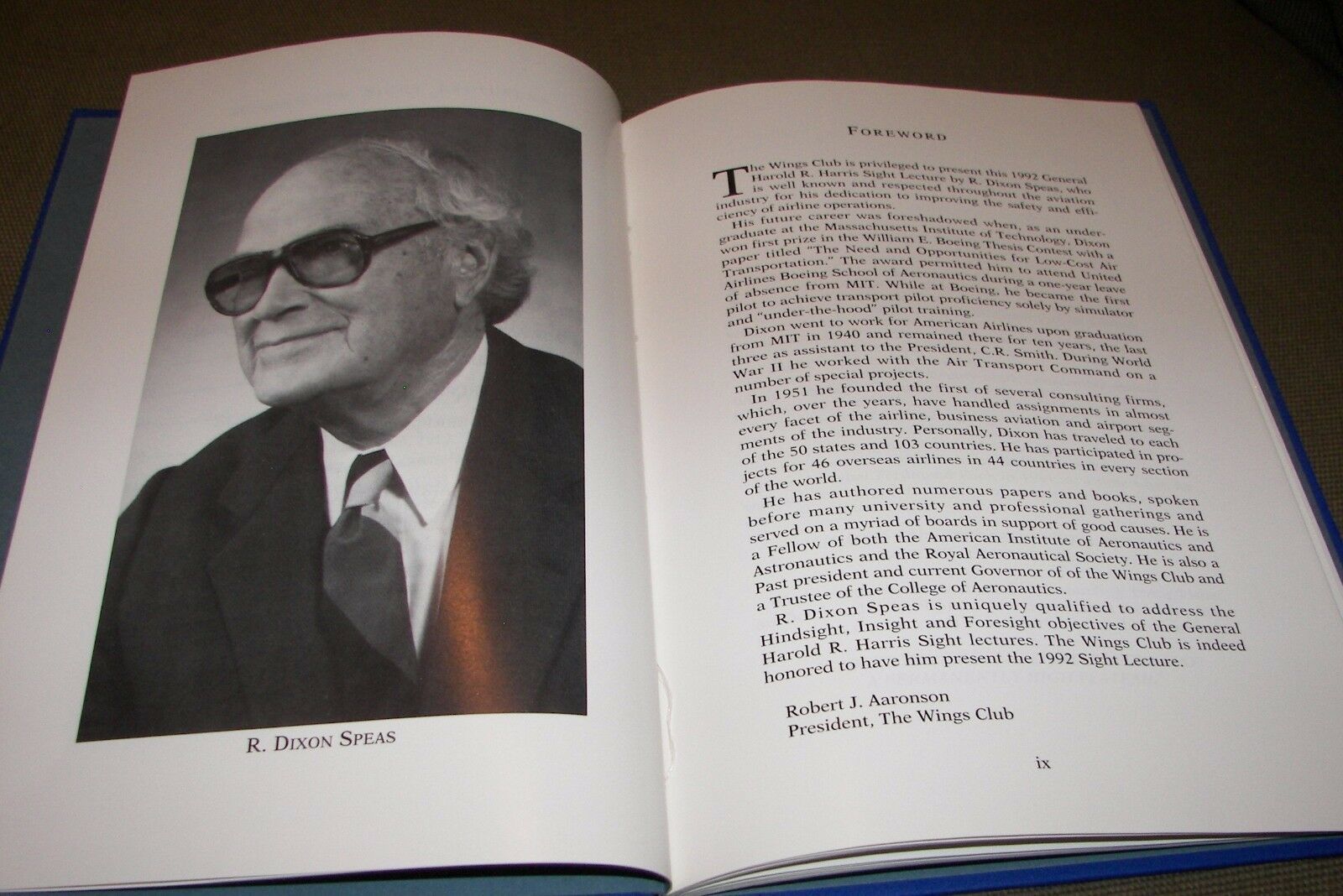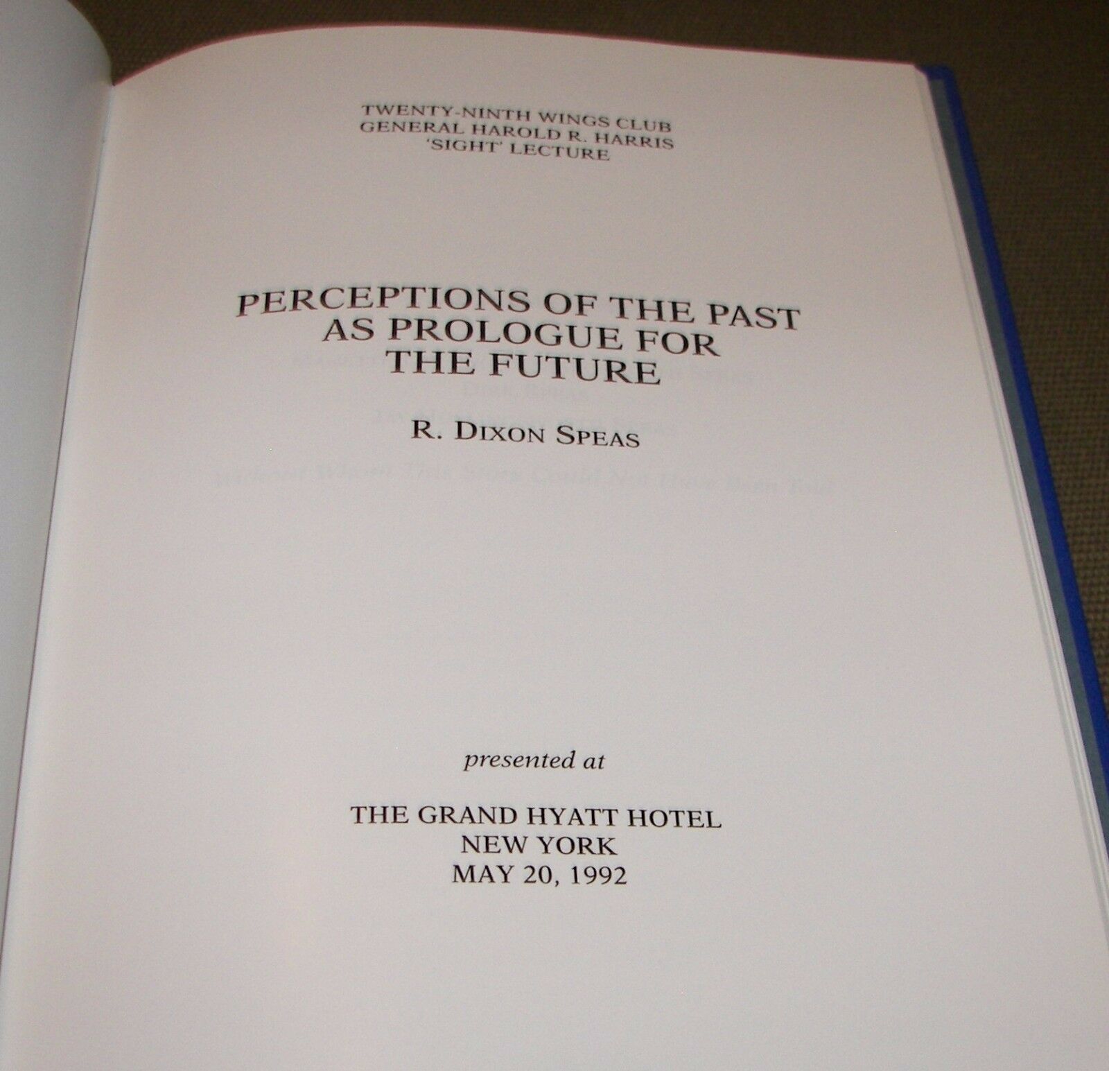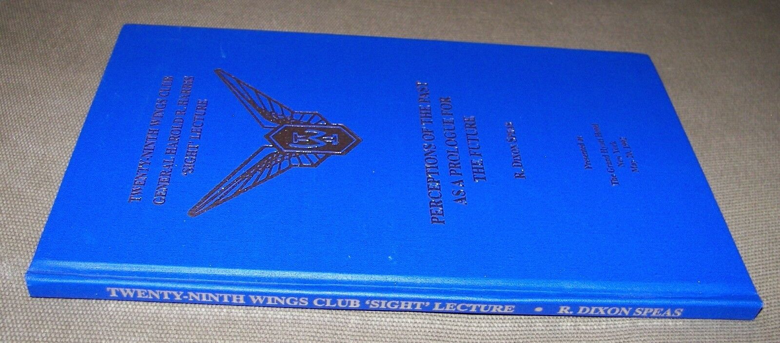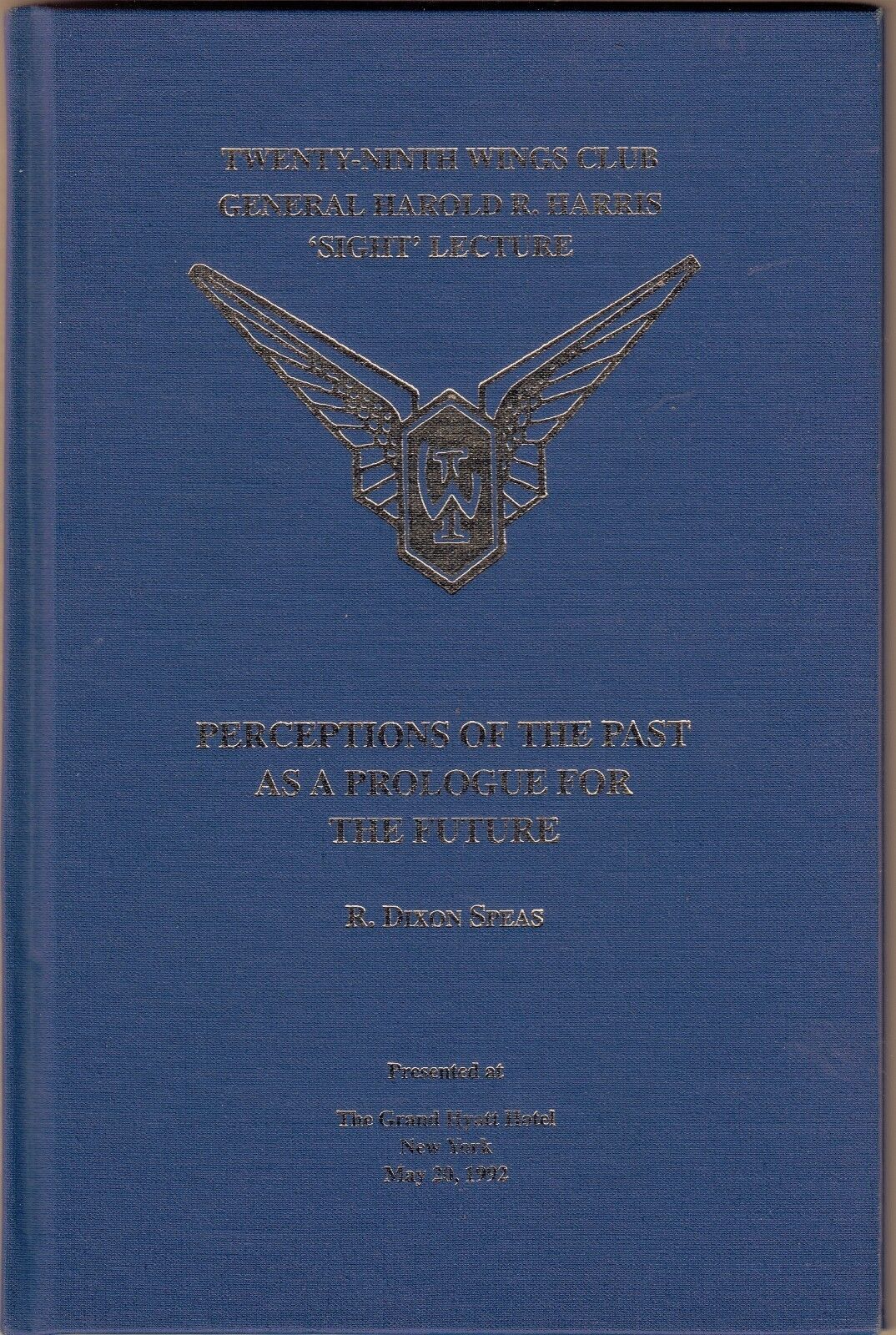 6.25" x 9.25", 60 page hardcover (no dustjacket, as issued) titled PERCEPTIONS OF THE PAST AS A PROLOGUE FOR THE FUTURE by R. Dixon Speas/ The Wings Club, Twenty-Ninth Wings Club General Harold R. Harris 'Sight' Lecture, Presented at The Grand Hyatt Hotel, New York, May 20,1992/ Reflections by R. Dixon Speas of aviation operations fifty years ago, the present, and fifty years ahead with respect to general aviation, airlines, business aircraft, aircraft charter, air medical services, air cargo, airports, and safety matters.Upon graduation from MIT in 1940, Robert Dixon Speas began a ten-year career with American Airlines, where he qualified as a DC-3 co-pilot and oversaw the development of the first procedures and manuals for trans-Atlantic operation of C-47s, C-54s and C-87s. He served as Director of Maintenance and Engineering, Cargo Division and as Special Assistant to President C. R. Smith. He left American Airlines to found the first of several consulting firms that provided opportunities to solve problems in almost every facet of the airline, business aviation and airport segments of the aviation industry in 45 countries around the world. He managed these firms until a few months before his death in 1998. He wrote and presented a number of books, articles and papers including Airplane Performance and Operation, Technical Aspects of Air Transport Management, and Pilot's Technical Manual.