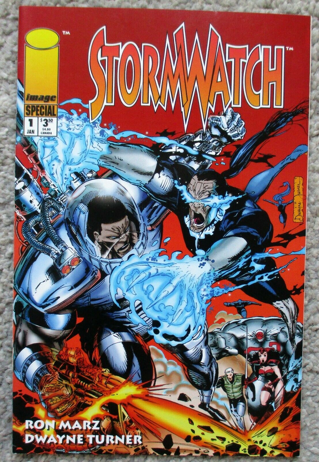 #1 (March 1993) Created and written by Brandon Choi and Jim Lee. Art by Scott Clark and Trevor Scott. They are StormWatch, the world's most elite anti-terrorist super powered strike force. There's Battalion, field commander, empowered with psionics and armed with a battlesuit that gives him the firepower of his namesake. Fuji is a mountain of a man from Japan whose super human strength is only matched by his great heart. Diva is a South American beauty with alabaster skin and a scream that can literally shatter steel. Hellstrike is super-fast and can project powerful force bolts. Winter, a hero from Russia, can absorb and manipulate massive amounts of energy. And residing over them all, high above in the orbiting space station Skywatch, is the Weatherman, a cybernetically enhanced commander with eyes all over the world, ever vigilant and uncompromising when it comes to planet Earth's safety. When Battalion's younger brother gets caught in the crossfire in a battle between StormWatch and their malevolent counterparts the Mercs, the young man's life will never be the same again. 32 pages, FC. NOTE: 1st appearance of Battalion, Synergy, Winter, Fuji, Hellstrike, Strafe, Diva and Weatherman One (Henry Bendix). Cover price $1.95.