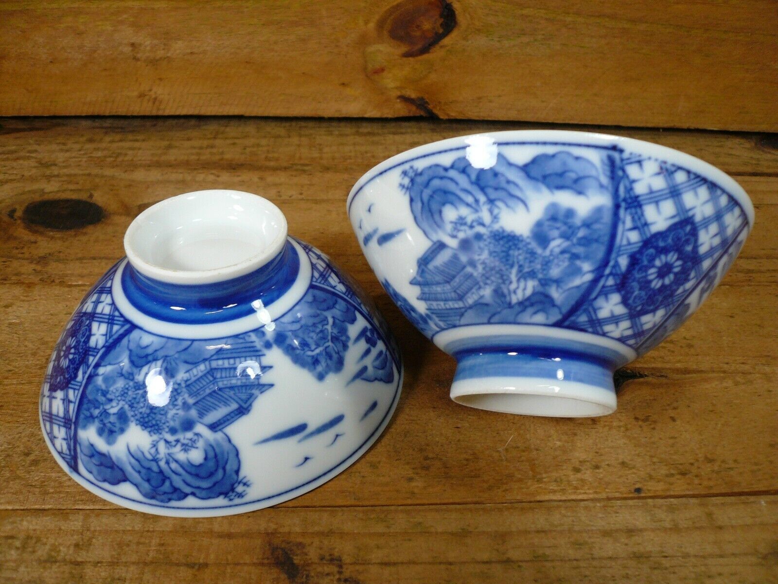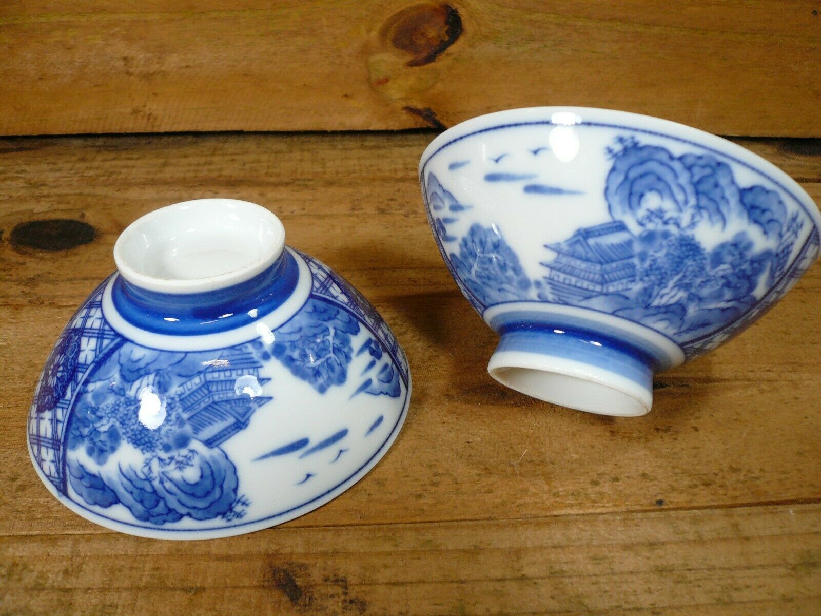 Japanese Set of 2 Fine Porcelain Footed Soup Bowls Pagoda Blue & White