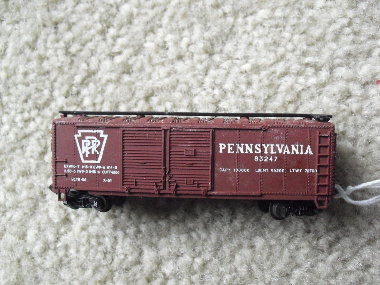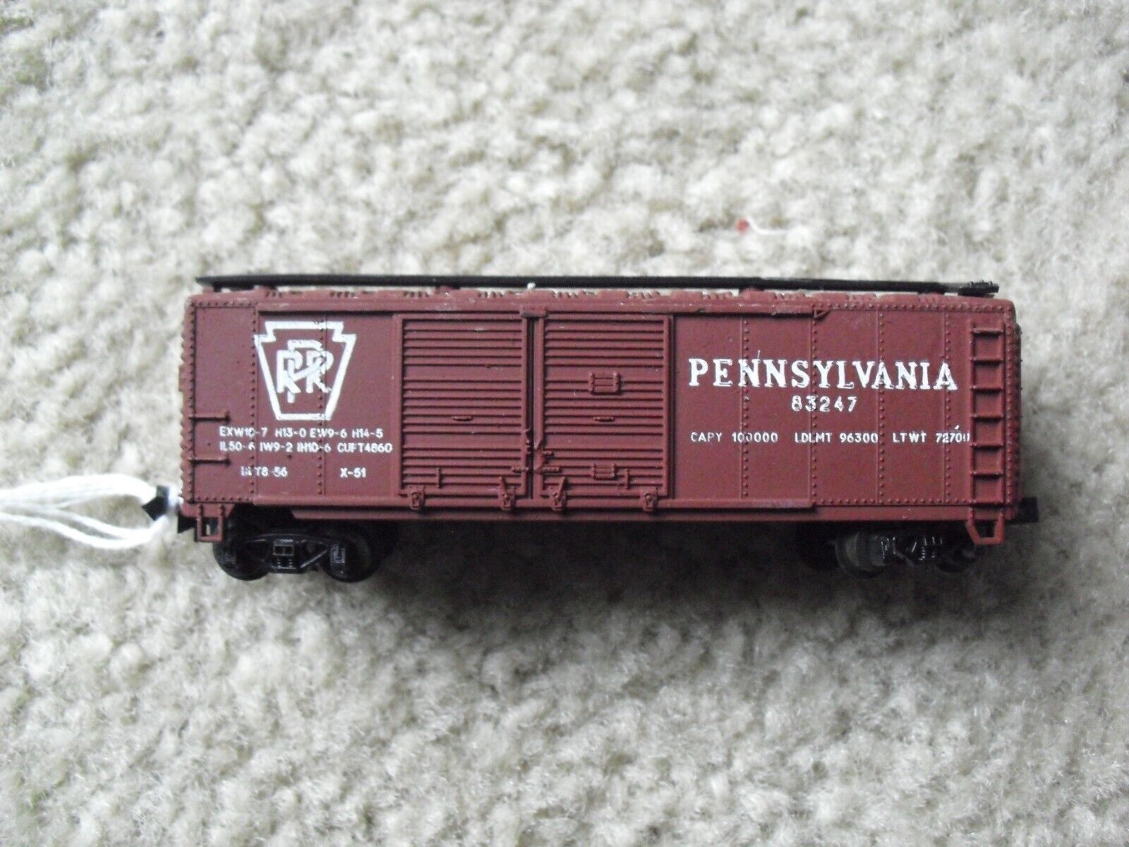You are bidding on a nice looking, N Scale Atlas, Pennsylvania PRR 83247 box car in the pictures. 3 1/4 inches long. Great shape, very light use, no issues to note, could use some fine cleaning. Zoom in for details.