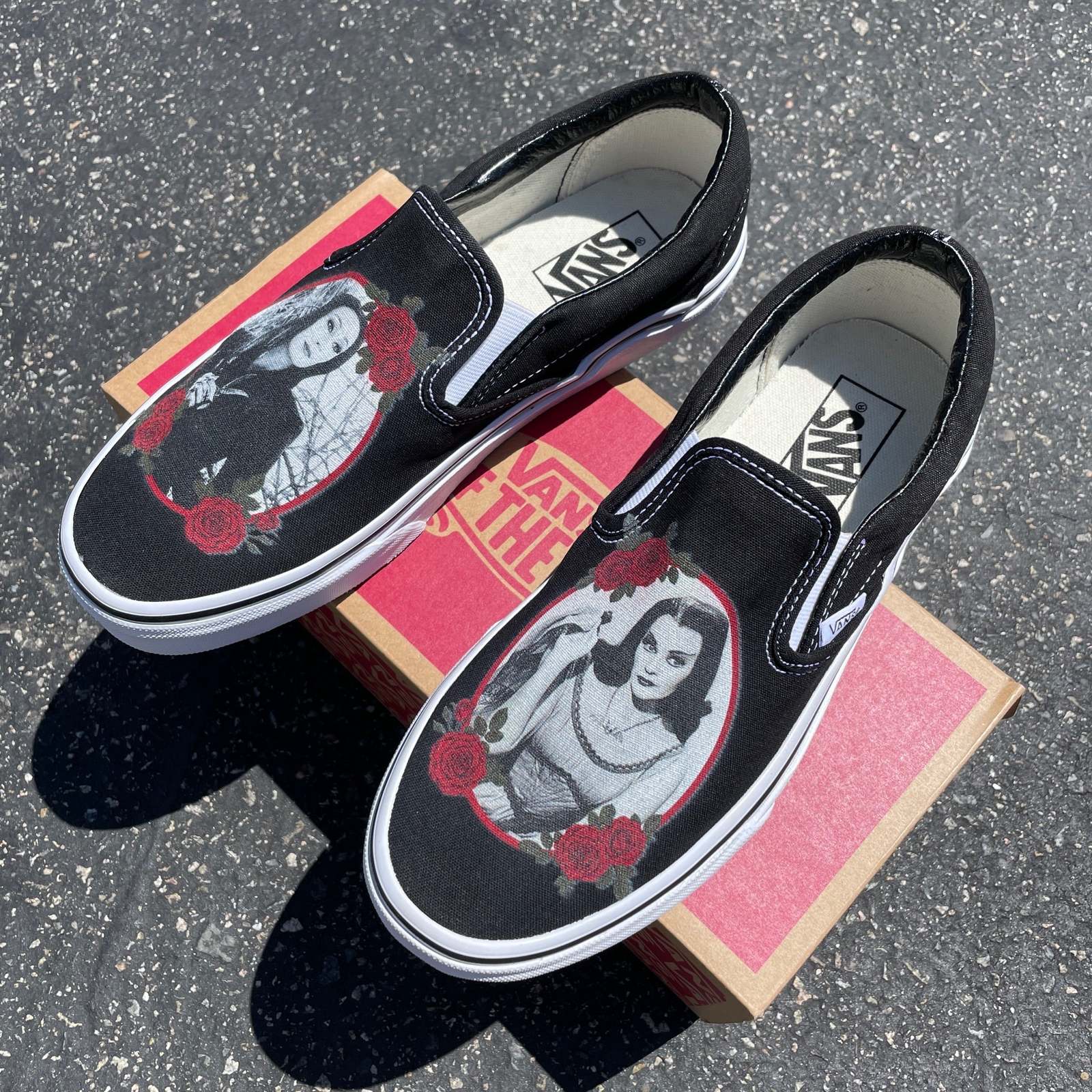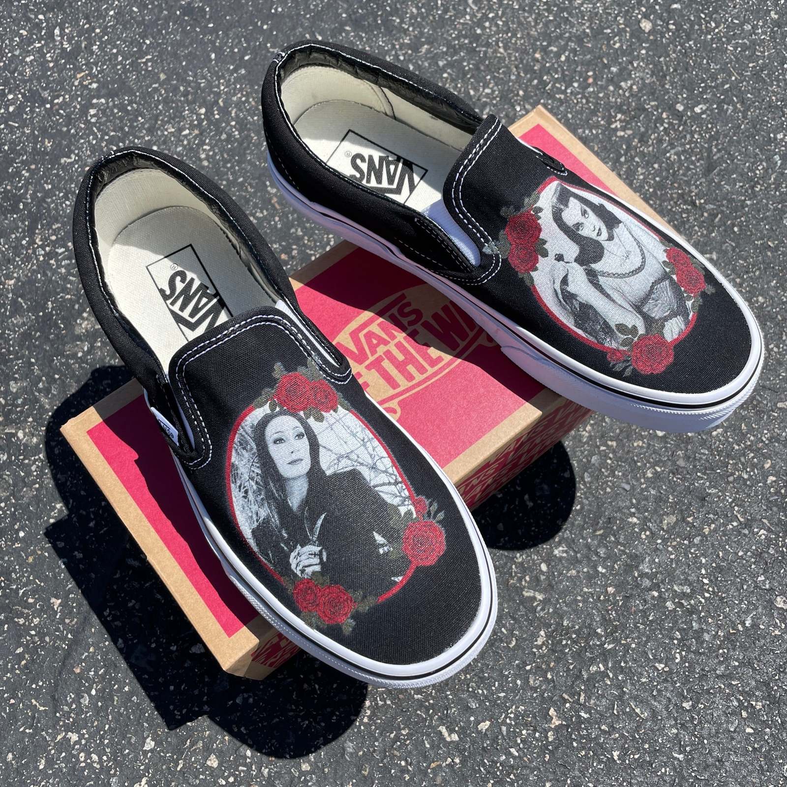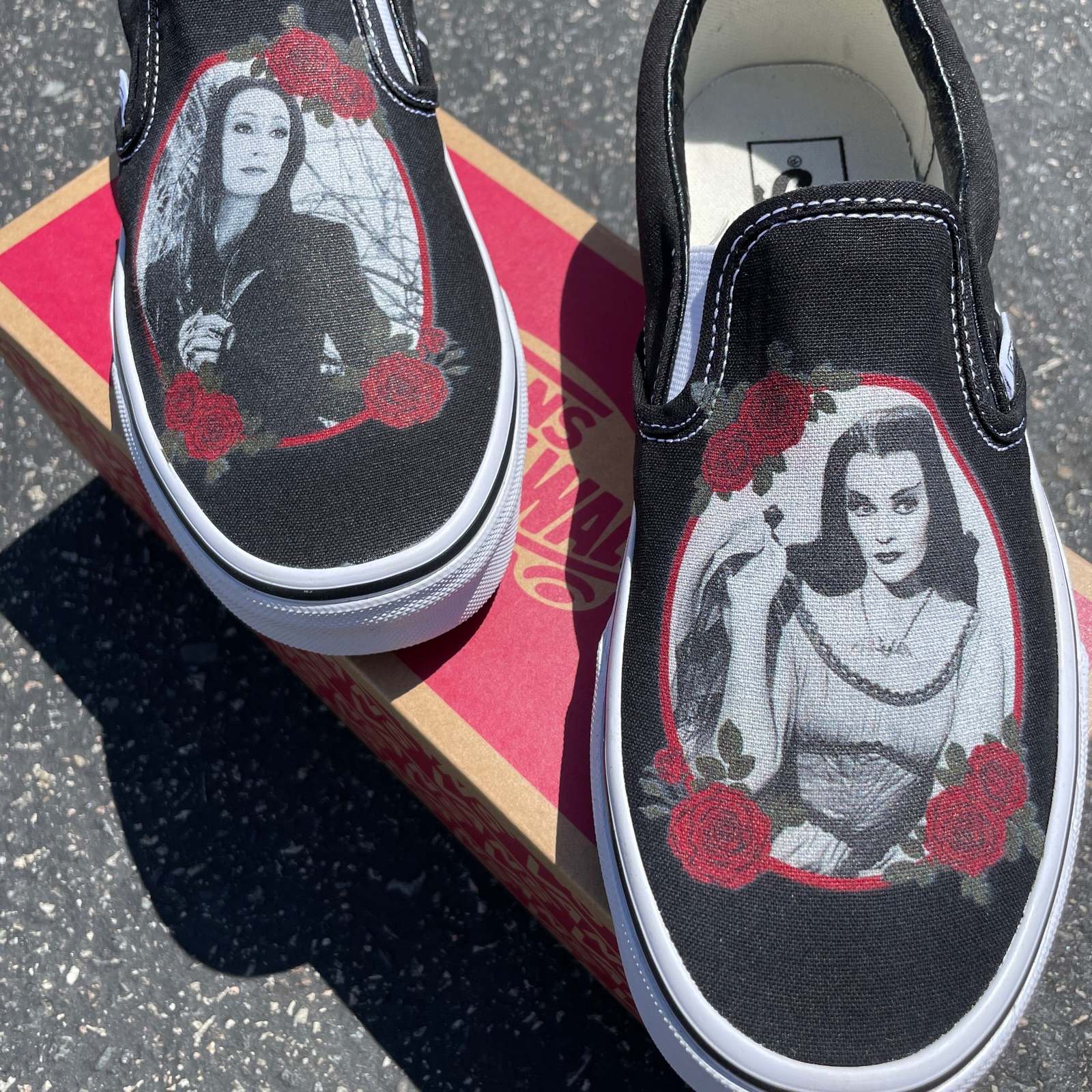 Goth Goddesses Morticia Addams and Lily Munster Custom Slip On Vans - Men/Women