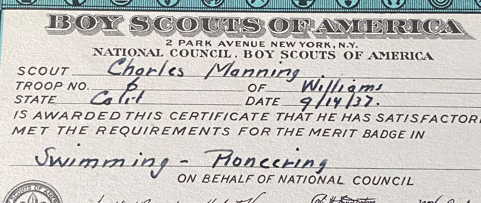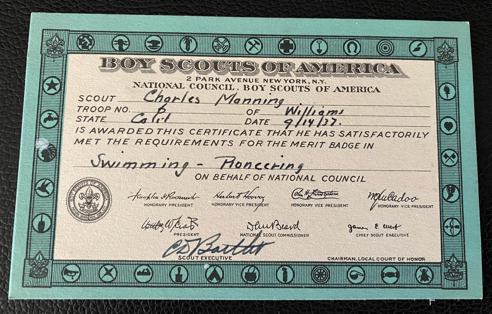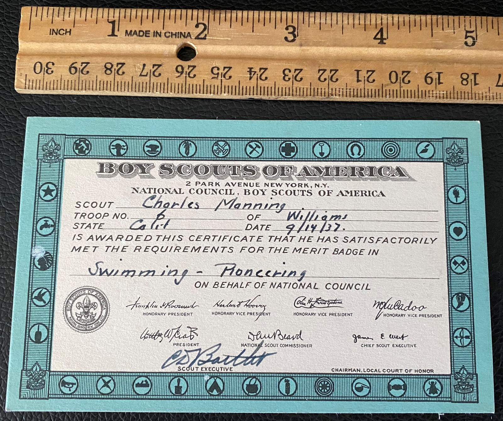 1937 Boy Scout Swimming Pioneering Merit Badge Card