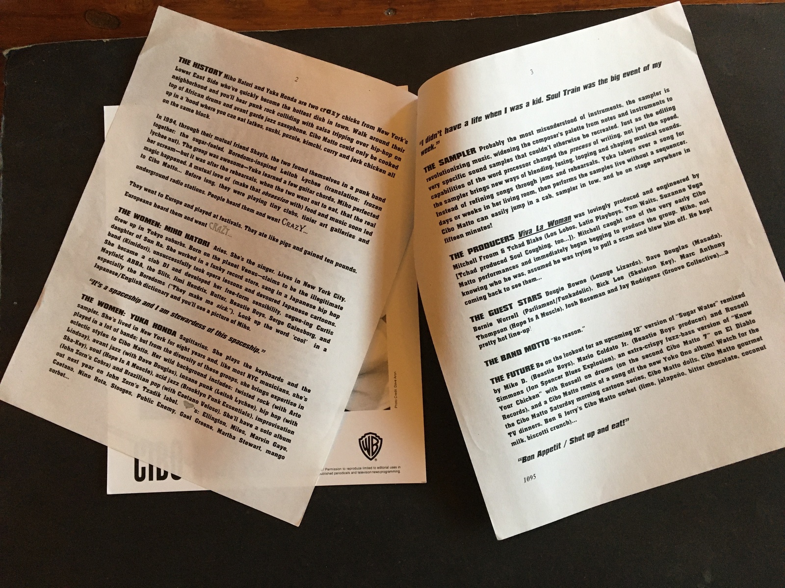 Cibo Matto - Original B W Press Release and Promo Photo (8"x10" press kit, US promo) 1995 Warner Bros. condition: VG++ (Includes 2 page (1 page double-sided plus 1 page single sided) press release on WB letterhead condition photo :VG++ to M- .condition press release: VG+ slight tear in left corner of press release and partiall crease at top rightcorner)