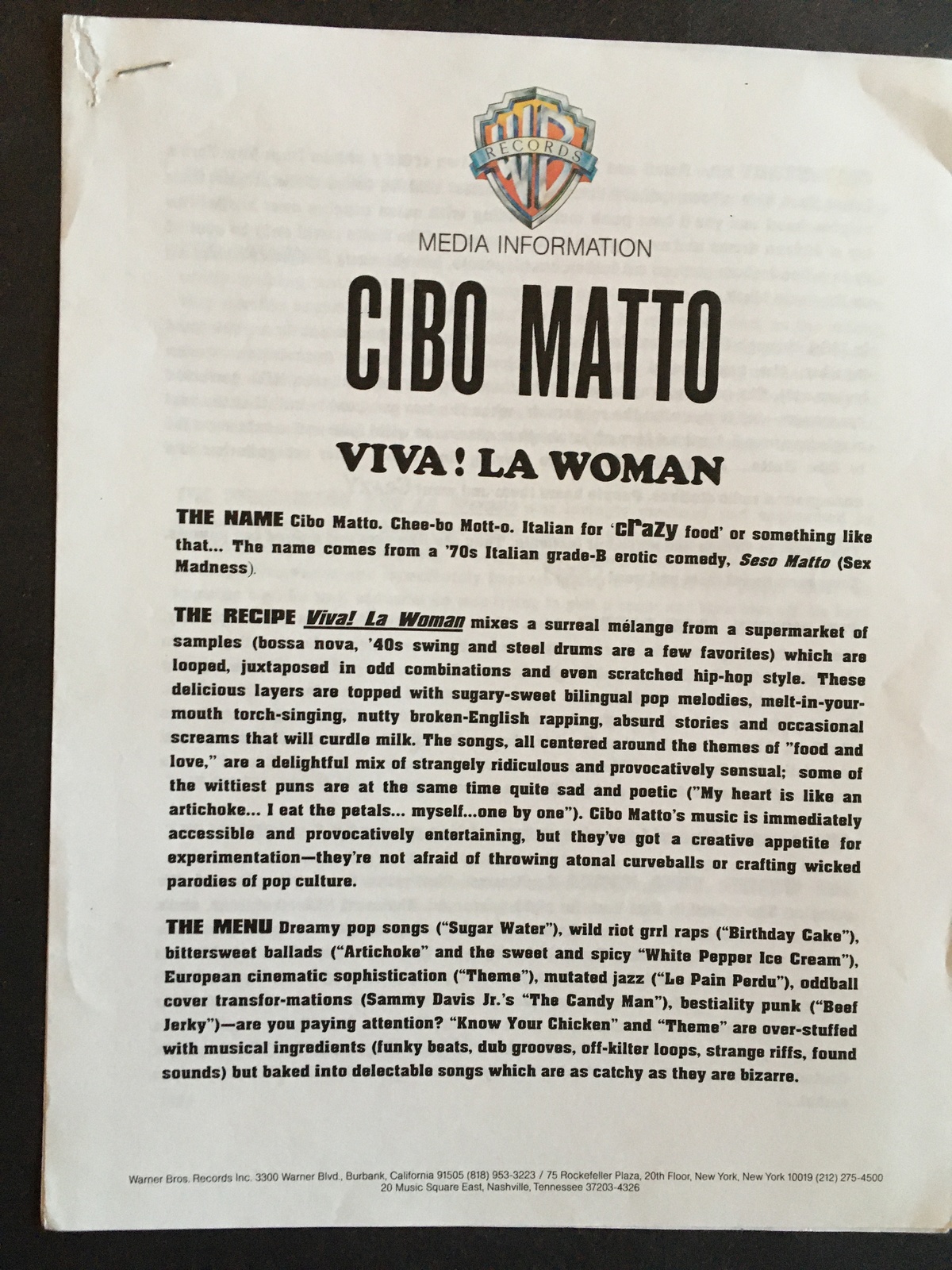 CIBO MATTO original 1995 Warner Bros. PROMO Press Kit with B&W PHOTO