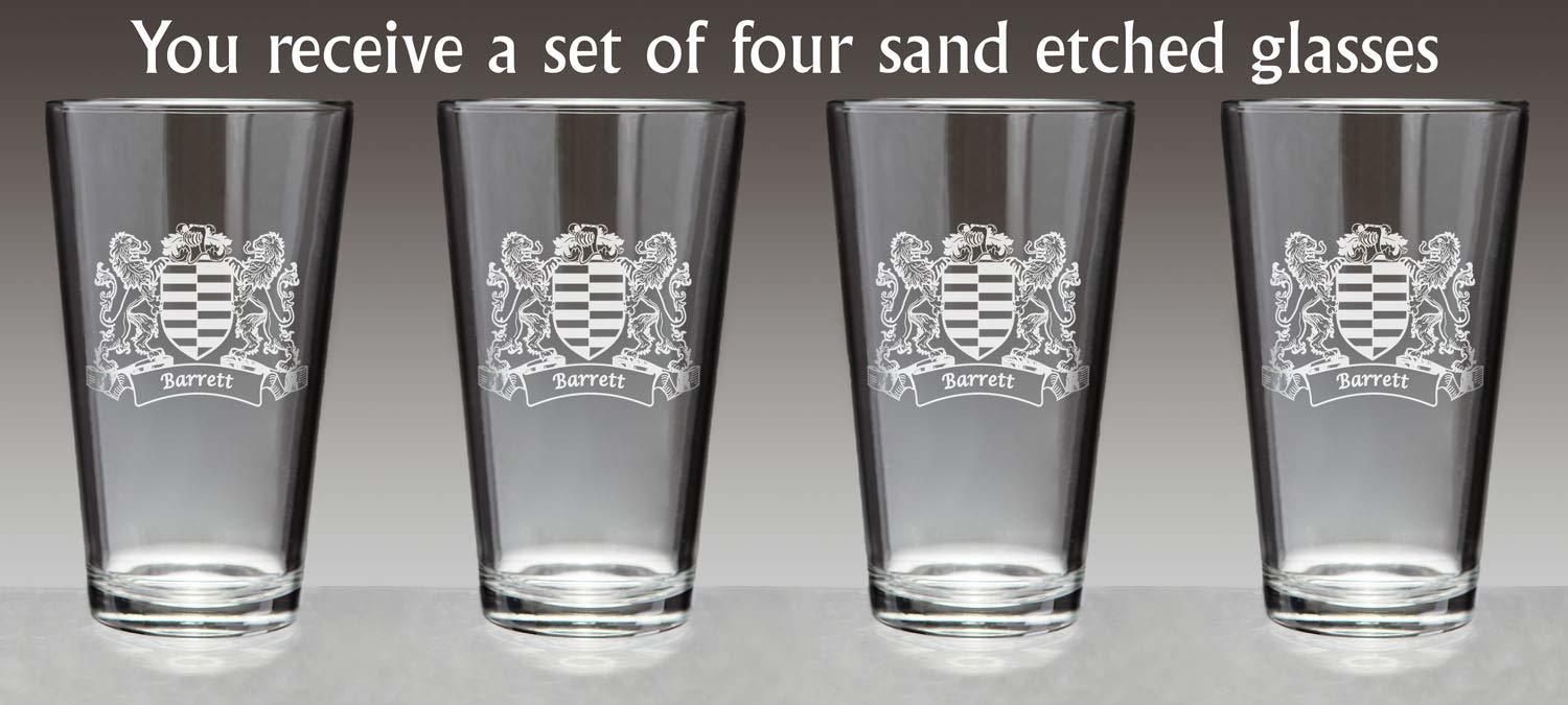 Barrett Irish Coat of Arms Pint Glasses - Set of 4 (Sand etched) with our full coat of arms with lions and all. Did you know that the standard 20 oz. pint glass is enforced by the National Standards Authority of Ireland? A full Irish pint is a tradition (and a duty). The Irish Rose can etch over 1000 Irish family names and authentic coats of arms on these high-quality, recognizably Irish Pint Glasses. A perfect wedding, groomsman, reunion, any-occasion gift. Choose from over 1000 available family crests. Authentic Irish Family Coat of Arms. Over 25 years of Heraldry Research. Set of 4 Irish Coat of Arms Pint Glasses (Sand Etched). High quality sand etching with extra heavy base.capacity: 20 Oz. Product height: 6-3/8". Bottom diameter: 2-1/2". Top diameter: 3-3/4".