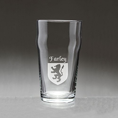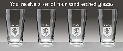 Product description: Farley Irish Coat of Arms Pub GlassesMade for comfort, the Pub Glass is less likely to slip out of your hand thanks to the lovely "hip" around the middle. This style of glass is sometimes called a Nonic Pint Glass or Imperial Pint Glass. The final stroke of genius is your Irish family name and coat of arms sand-etched on the side. 20 oz. in size and dishwasher and microwave safe. Choose from over 1200 available family coat of arms. USA. Authentic Irish Family Coat of Arms Over 25 years of Heraldry Research Set of 4 Irish Coat of Arms Pub Glasses (Sand Etched) High quality sand etching with heavy base Each glass holds a large 20 ounces of your favorite beverageShape improves grip strength :)Product Size:Height - 6 inhesBottom Diameter- 2.5 inchesMaximum Diameter - 3.5 inchesTop Diameter - 3.25 inchesCapacity - 20 ounces