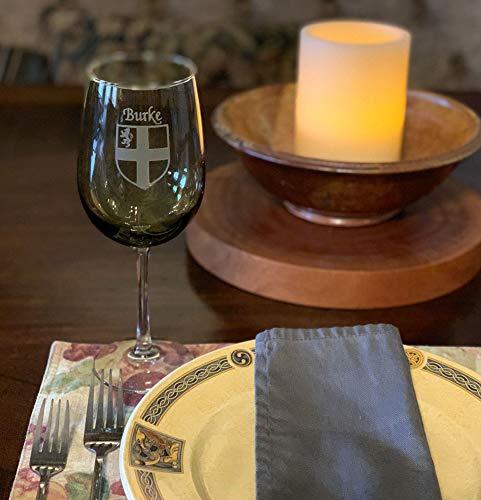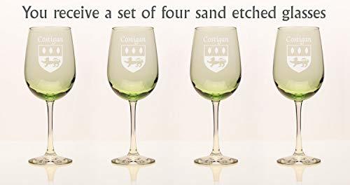 Costigan Irish Coat of Arms Green Wine Glasses - Set of 4. What occasion couldn't be made more special with a toast? And how special would it be to toast with wine glasses etched with your authentic Irish name and coat of arms, now in our brand new, elegant green color? For your most special occasions, or everyday weekday dinners, choose this durable, well-balanced and elegant wine glass, suitable for white or red. Each Irish coat of arms wine glass is permanently and professionally sand-etched with your surname and family crest. 17 oz. Choose from over 1000 available coat of arms.