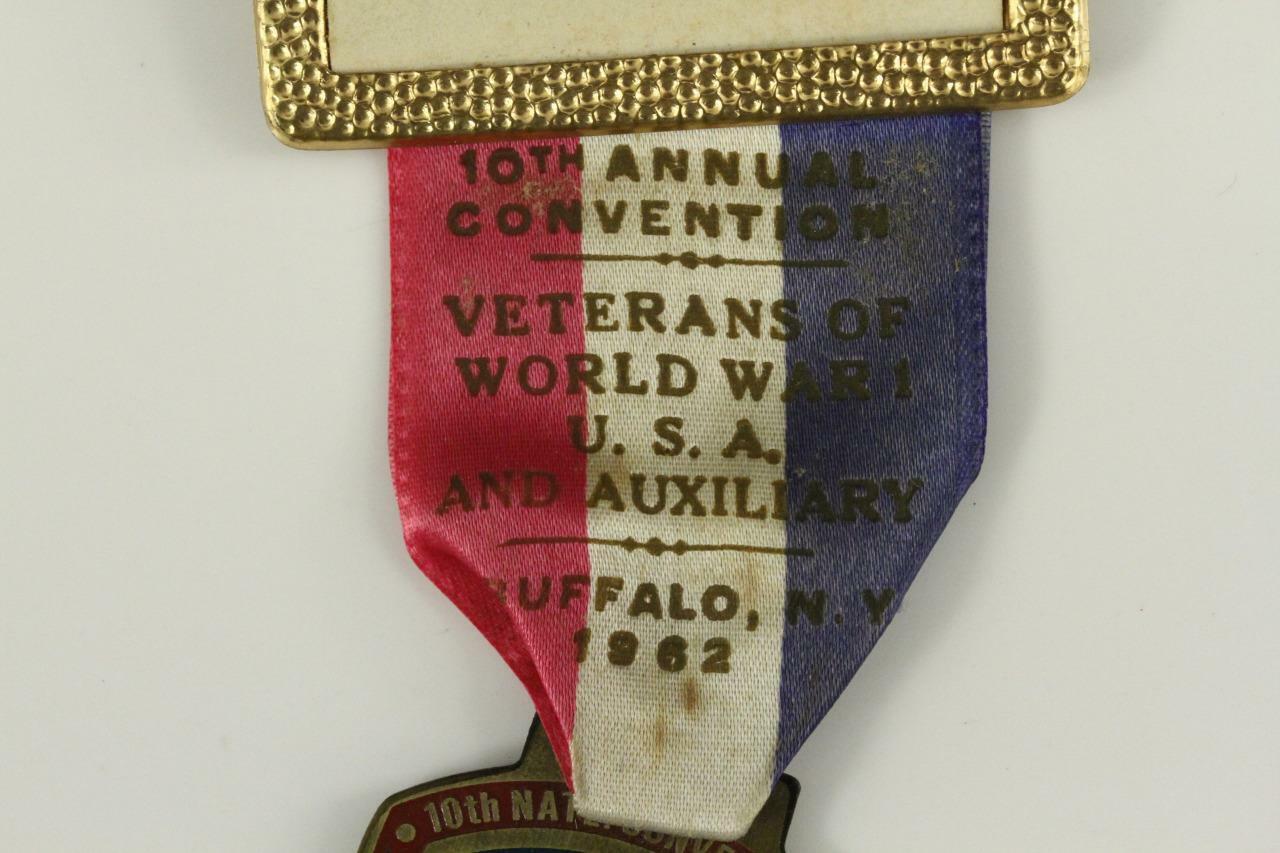 Vintage US Military Veterans of WWI and Auxiliary, 10th Annual National Convention Ribbon and badge, September 23-26 1962, Buffalo NY. No markings on back of ribbon or badge. Ribbon has some fading and dirt/rust/dust on it, the badge has some wear and patina on the front and back. Original Patina. Pin back. Please refer to the photos in the listing for further information on condtion. You get the exact piece you see in the photo.