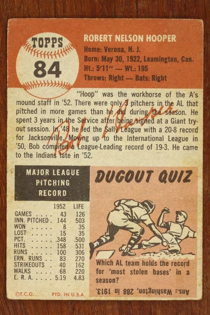 Vintage BASEBALL Card 1953 BOB HOOPER Pitcher Cleveland Indians Topps #84 - noted corner bumping.