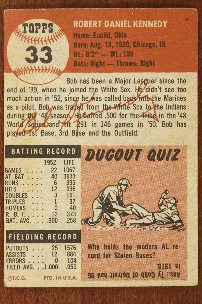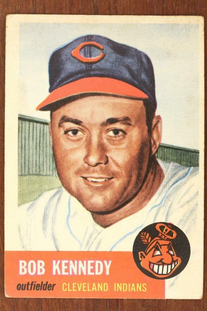 Vintage 1953 Baseball Card TOPPS #33 BOB KENNEDY Outfield Cleveland Indians. Light browning noted. Corner bumping.