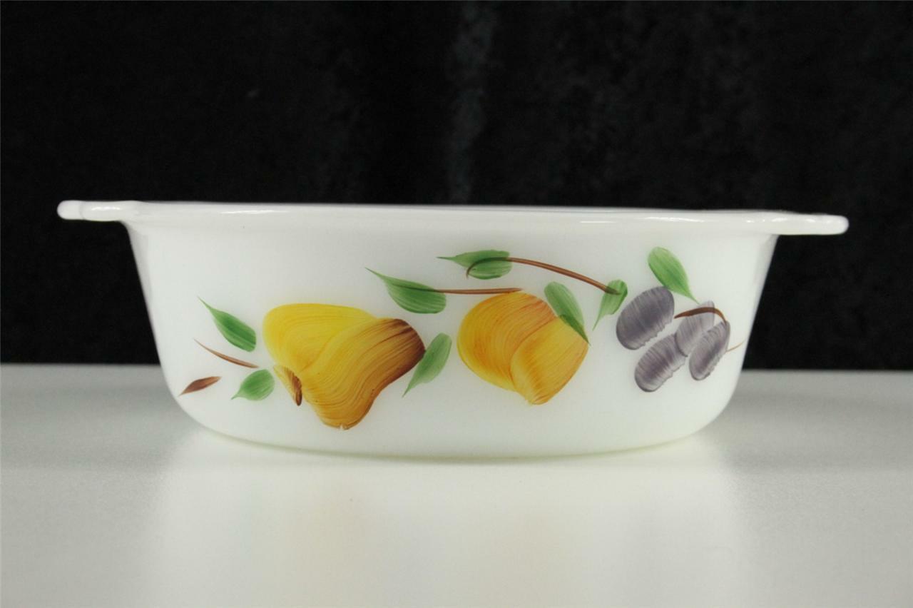 Vintage Kitchen Fire King Glass Milk Glass Gay Fad Pear Grape 1.5 QT Baker 447. 2.75" deep.