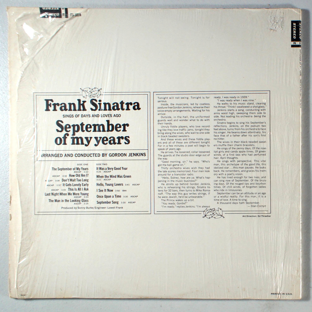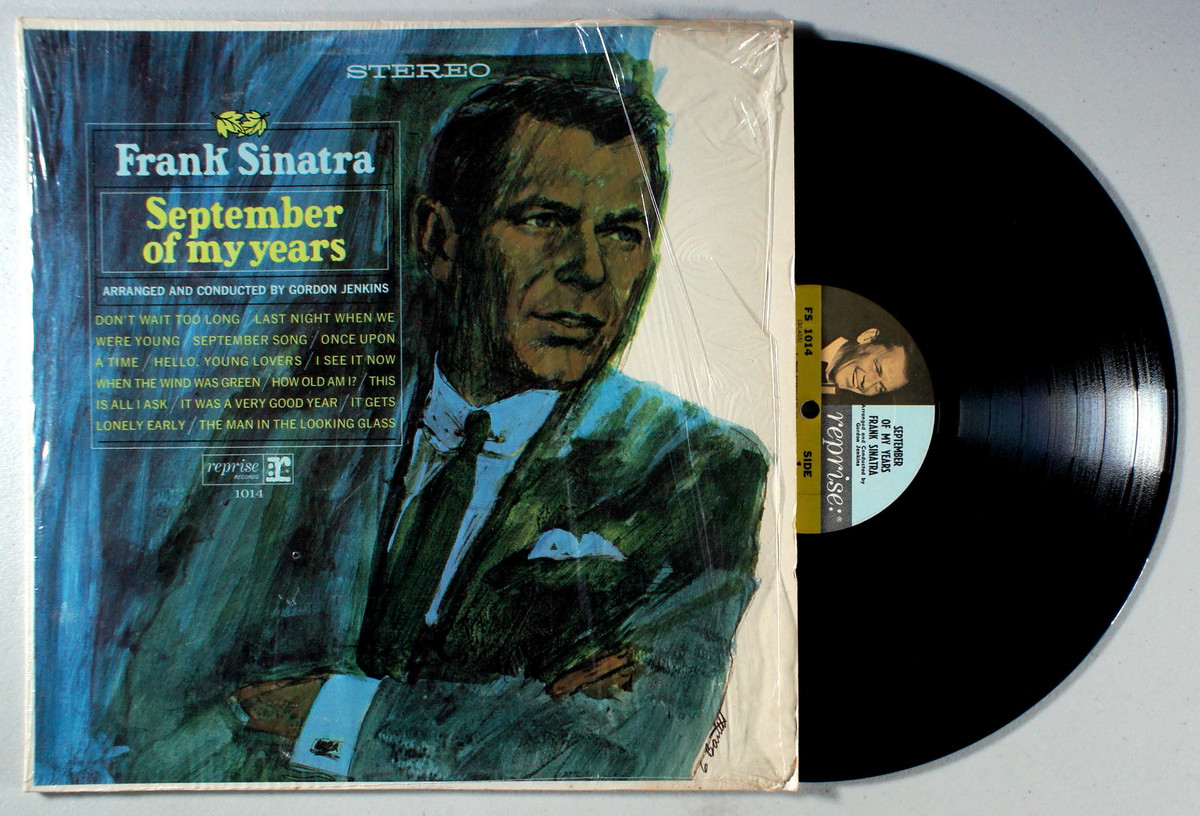 September of My Years, by Frank Sinatra, peaked at No. 5 on the Billboard Pop Albums chart. The orchestral arrangements are by Gordon Jenkins, their fifth album collaboration. In 2000 it was voted No. 190 in Colin Larkin's All Time Top 1000 Albums. Sinatra was to turn 50 years old in December 1965, and the release of this album along with A Man and His Music and Strangers in the Night marked a surge of popularity in his music. Both September of My Years and A Man and His Music won the Grammy Award for Album of the Year. CBS television cameras were rolling the night (earlier in the spring) that Sinatra recorded It Was a Very Good Year for the album. The edited result was included in a Walter Cronkite CBS News special (1965 SPECIAL REPORT: FRANK SINATRA), broadcast on November 16, 1965. Sinatra's performance of It Was a Very Good Year won the Grammy Award for Best Vocal Performance, Male, at the Grammy Awards of 1966. Arranger Gordon Jenkins was awarded the Grammy Award for Best Instrumental Arrangement Accompanying Vocalist(s) for the same song. This was the first album Sinatra and Jenkins had recorded together since 1962's All Alone. Jenkins and Sinatra would next work together on the 1980 album Trilogy: Past Present Future. September of My Years is a concept album exploring the "who am I" questions and perspectives that someone, particularly a man, faces upon entering middle age. For instance, in It Was a Very Good Year, the narrator looks back upon his life at ages 17, 21, 35, and now, in his personal "September." The structure of the song, which lasts almost four and a half minutes, was highly unusual for a popular song of the time, as it exceeded most other songs of that era by over a minute. In the process, the narrator "takes his time" to review his past relationships with a bittersweet mixture of satisfaction and regret. Similarly, in Hello, Young Lovers, the narrator offers to young people the guidance and wisdom he has gleaned from experience. In other songs, like The Man in the Looking Glass and Last Night When We Were Young, the narrator conducts an internal dialogue that reviews both the accomplishments and disappointments of his life. In addition to the lyrical content, the musical background reflects a more mature Sinatra than the Capitol recordings of the 1950s and his Reprise albums of the early 1960s. Instead of the big-band, "swing" arrangements with horn sections of those earlier songs, this LP features an orchestra with nine violinists. These strings provide a delicate interplay with the vocals, allowing the listener to easily hear and take in the lyrics.