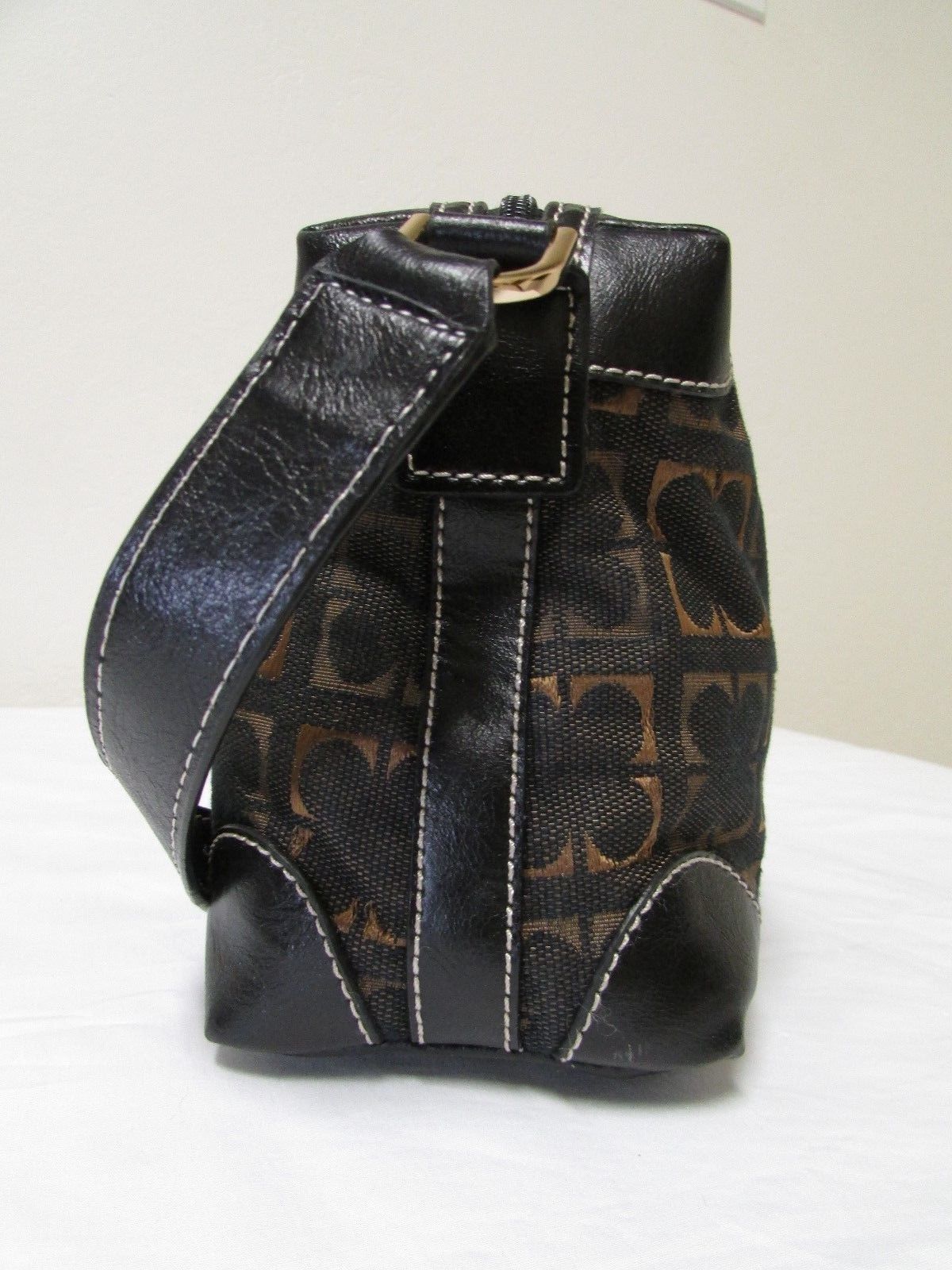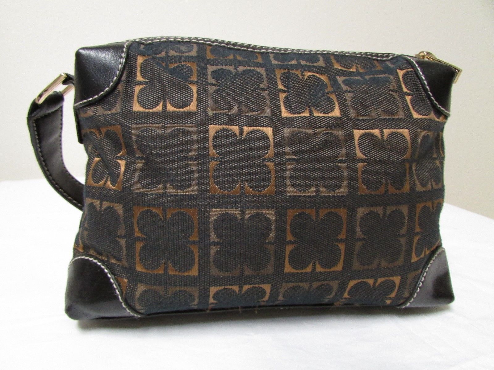 Like new, if ever used, black with brown and gold fabric, Liz Claiborne small shoulder handbag, durable tone on tone cotton and polyester fabric, beautiful tan 100% polyester lining, interior includes 1 zip pocket with Liz Claiborne placard, 2 open pockets, gold tone hardware with Liz Claiborne logo on front, top zip closure also with Liz Claiborne logo pull