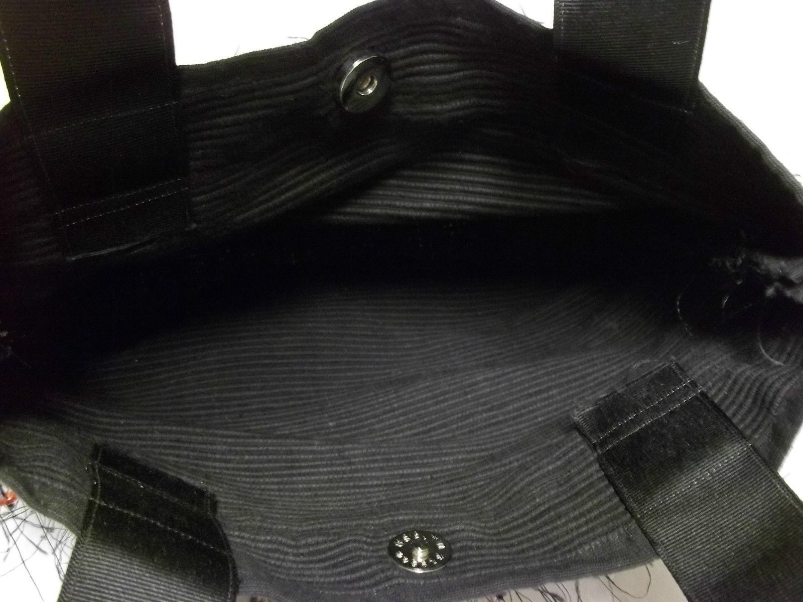 Very cute, black corduroy cloth bag, beautiful sassy beaded trim, wide double straps, snap closure