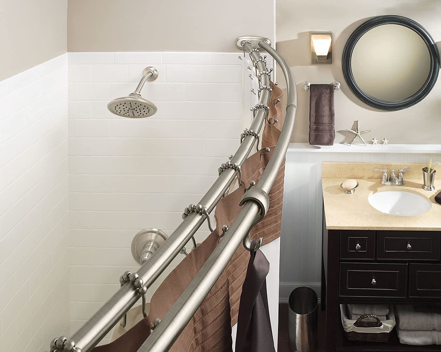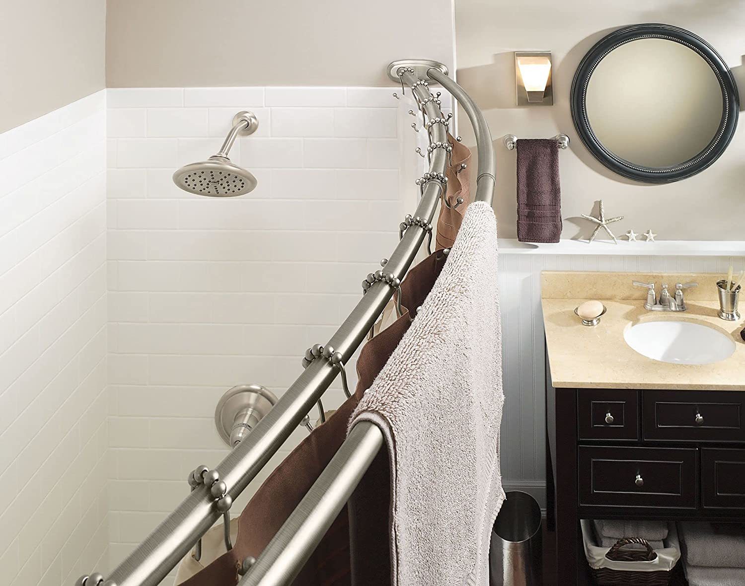 This double curved shower rod is adjustable and expands to fit shower enclosures between 57-Inch and 60-Inch. The unique double bar design also provides different levels of functionality. Consumers can utilize the dual bars to separate their shower liner from their decorative curtain or use the extra bar for hanging towels or other essentials. The curved rod allows an additional 6-Inch of elbow room, without having to remodel. This rod comes in a brushed nickel finish that provides a lightly brushed warm grey metallic look. From finishes that are guaranteed to last a lifetime, to faucets that perfectly balance your water pressure, Moen sets the standard for exceptional beauty and reliable, innovative design.