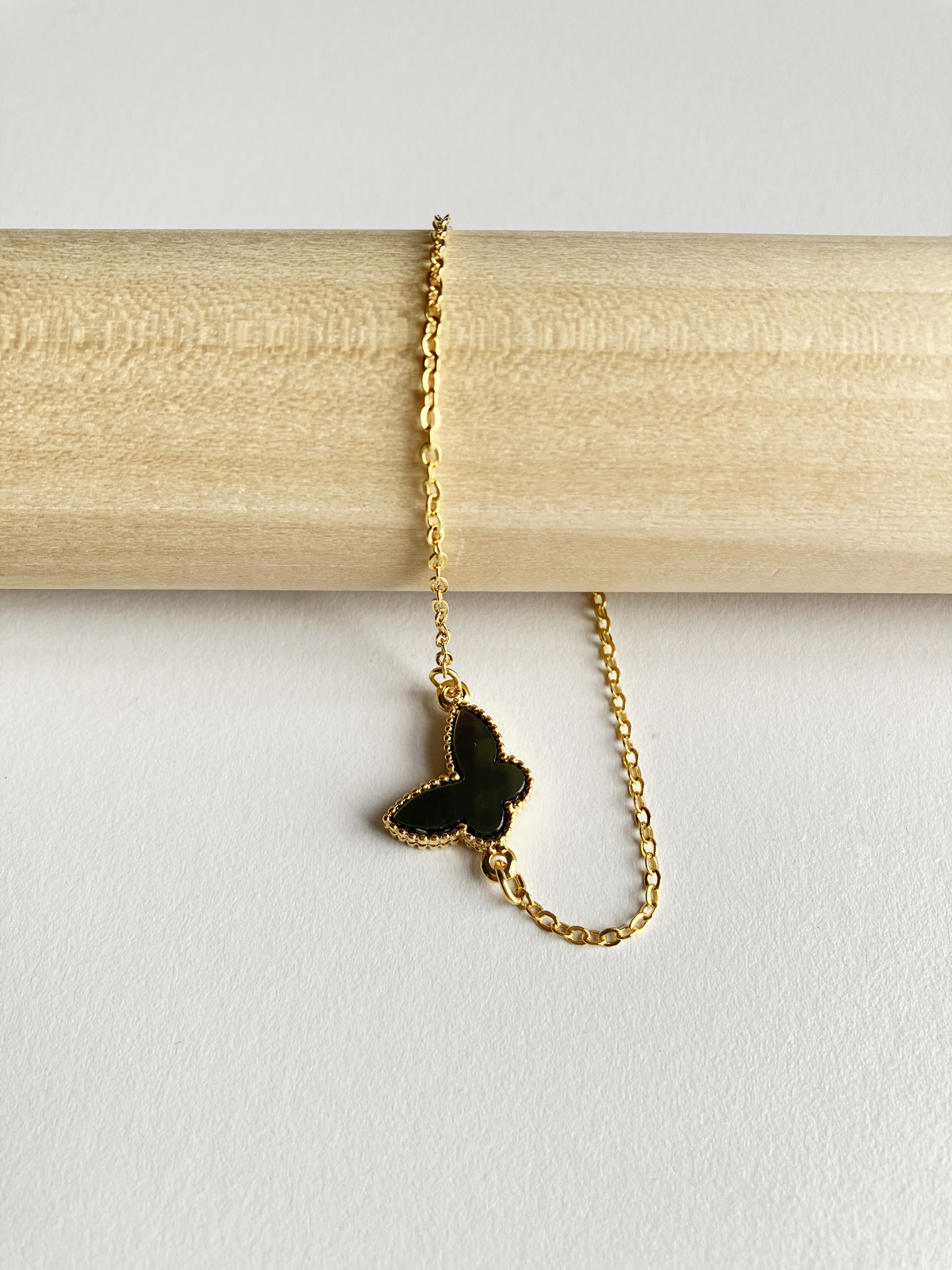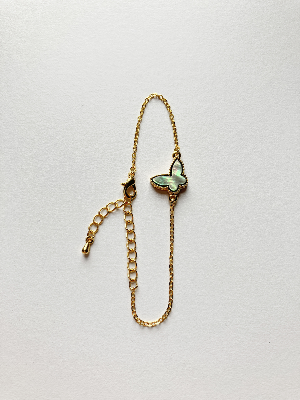 Butterfly motif of gray mother of pearl set on an adjustable 8" gold plated non-tarnishing surgical steel chain with a lobster clasp.