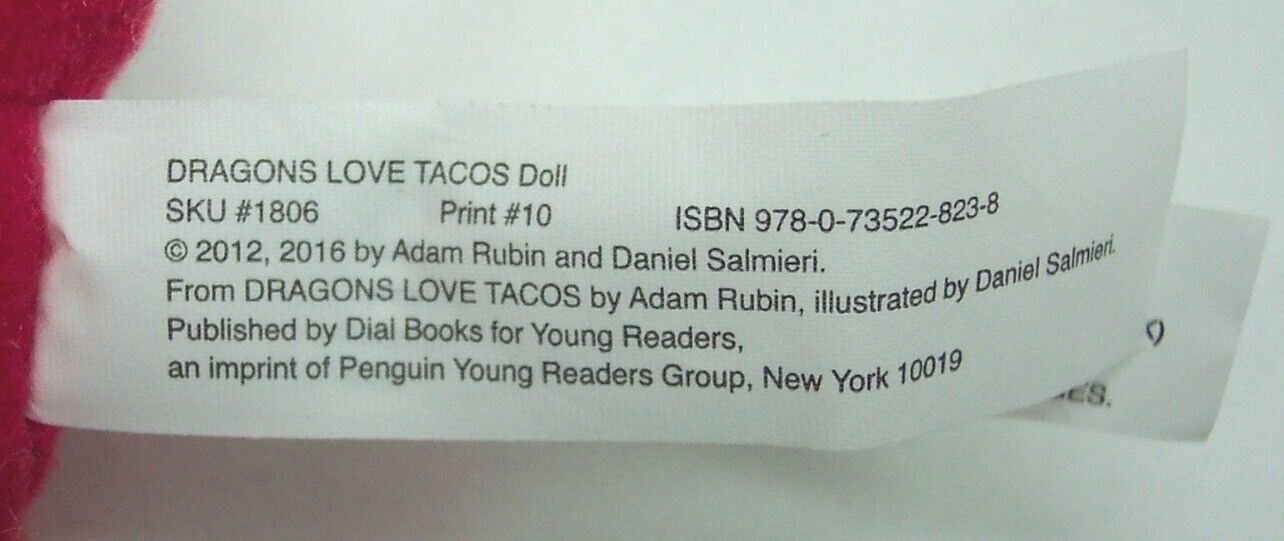 This is a Dragons Love Tacos RED DRAGON W/ TACO Plush Stuffed Animal Toy. Made by Merry Makers in 2016. It is 6 1/2 inches tall. It is in Great Condition. Based on the book by Adam Rubin. CUTE and FUNNY! It is CLEAN! No Stains, Tears or Defects. Combine auctions to save on shipping. Please contact me if you need to make other payment arrangements. AG
