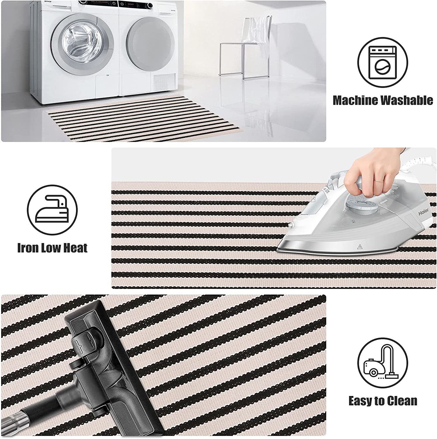 ?CLASSIC DESIGN?-black striped rug add a bit of your of style to any room with this black and cream striped rug featuring a cream background and pattern of black stripes,modern and timeless design! ?DURABLE and COMFORTABLE?-front porch doormat woven from superior 100% cotton construction,durable, comfortable and for long lasting use ?VERSATILE RUG?-LEEVAN black and cream striped boho rug perfect addition to front porch/layer under a doormat/perfect for farmhouse/hallway/home office/trendy entryway/living room/bedroom/playroom/bathroom/kitchen/patio ?EAST to CARE?-use vacuum cleaner, hand wash hang air dry or machine wash in cool water with gentle setting and tumble dry on low setting ?KINDLY REMINDER?-Use of indoor outdoor rug recommended, the color of the real item may vary slightly, due to photography and different computer show; due to the different methods of measurement will be few deviation