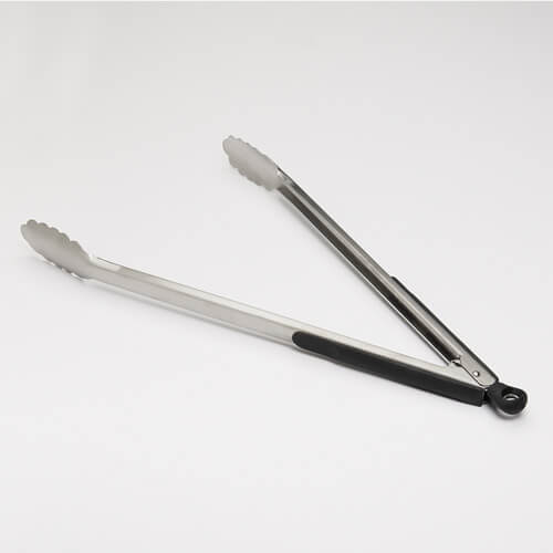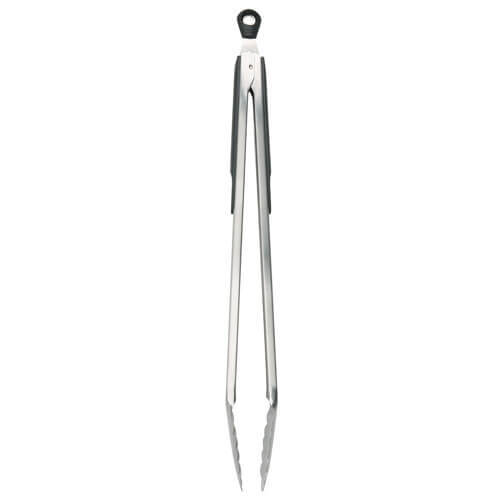 Tongs are a true kitchen workhorse, so you need a sturdy pair. The OXO Good Grips 16-inch Tongs are built to last with high-heat-resistant stainless steel. Our Tongs feature scalloped edges for a secure grip whether you're turning a big, thick steak or flipping a shrimp. Soft, non-slip handles absorb pressure so you can grip, toss, turn and flip without strain. The Tongs lock closed for compact storage when hanging or in a drawer. 16 in/ 40.64 cm.
