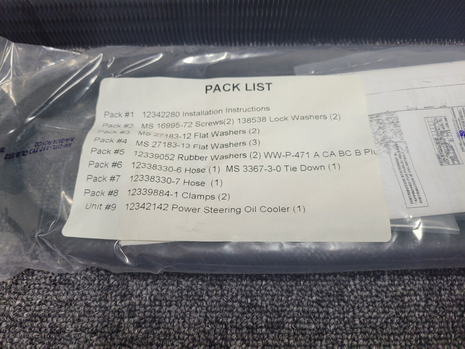 19207, 11608950-01, clamp, 2; 19207, 12338330-6, hose, 1; 19207, 12338330-7, hose, 1; 19207, 12339052, washer, 2; 19207, 12342142, power steering oil cooler, 1; 19207, 12342280, instruction sheet, 1; 96906, MS16995-72, screw, 2; 96906, MS27183-12, washer, 2; 96906, MS27183-13, washer, 2; 96906 MS3367-3-0, tiedown, 1; 19207, 24617-138538, washer, 2; 19207, WW-P-471, plug, 1