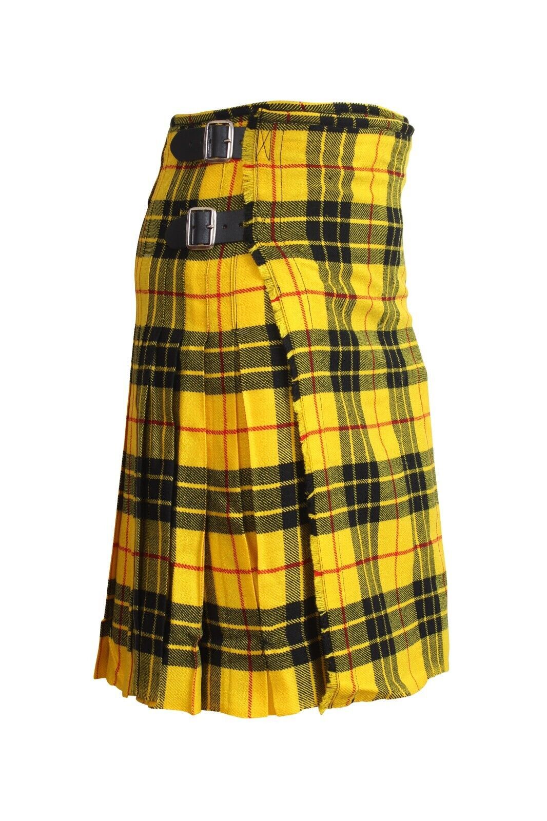 Kilt has a fringed apron along with 3 metal buckles and leather straps.