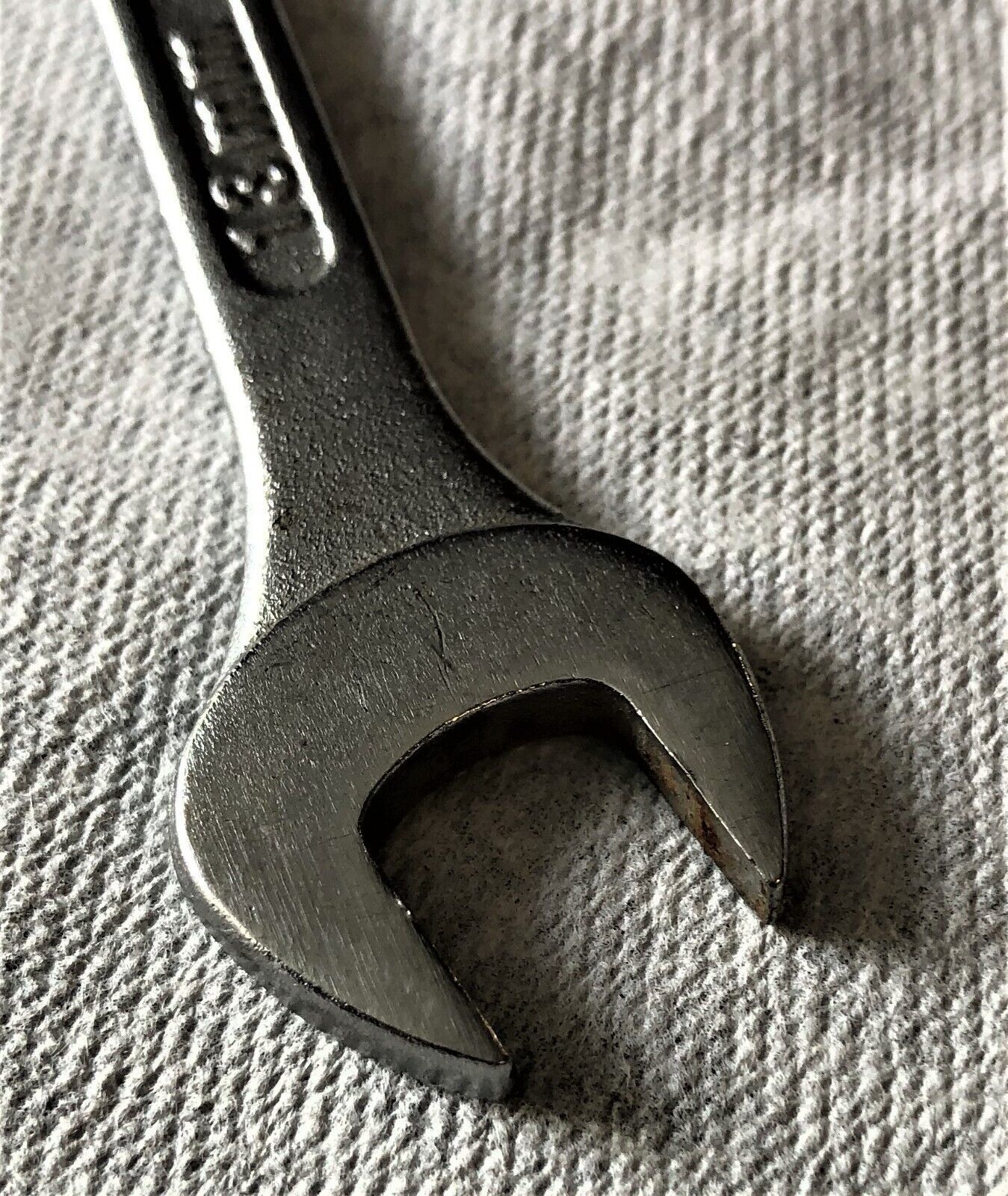 Nice wrench, no engraving and measures 5 5/8".